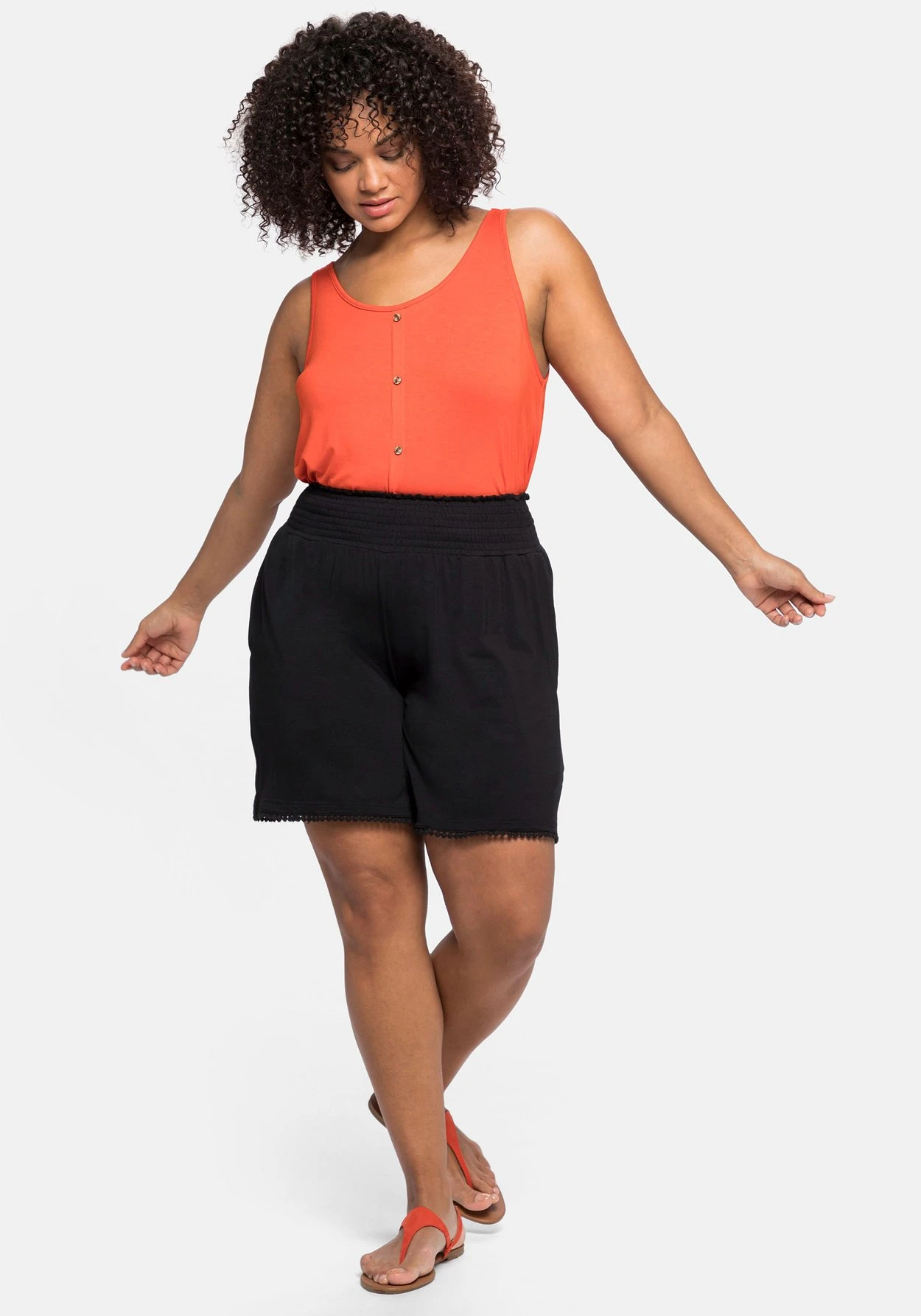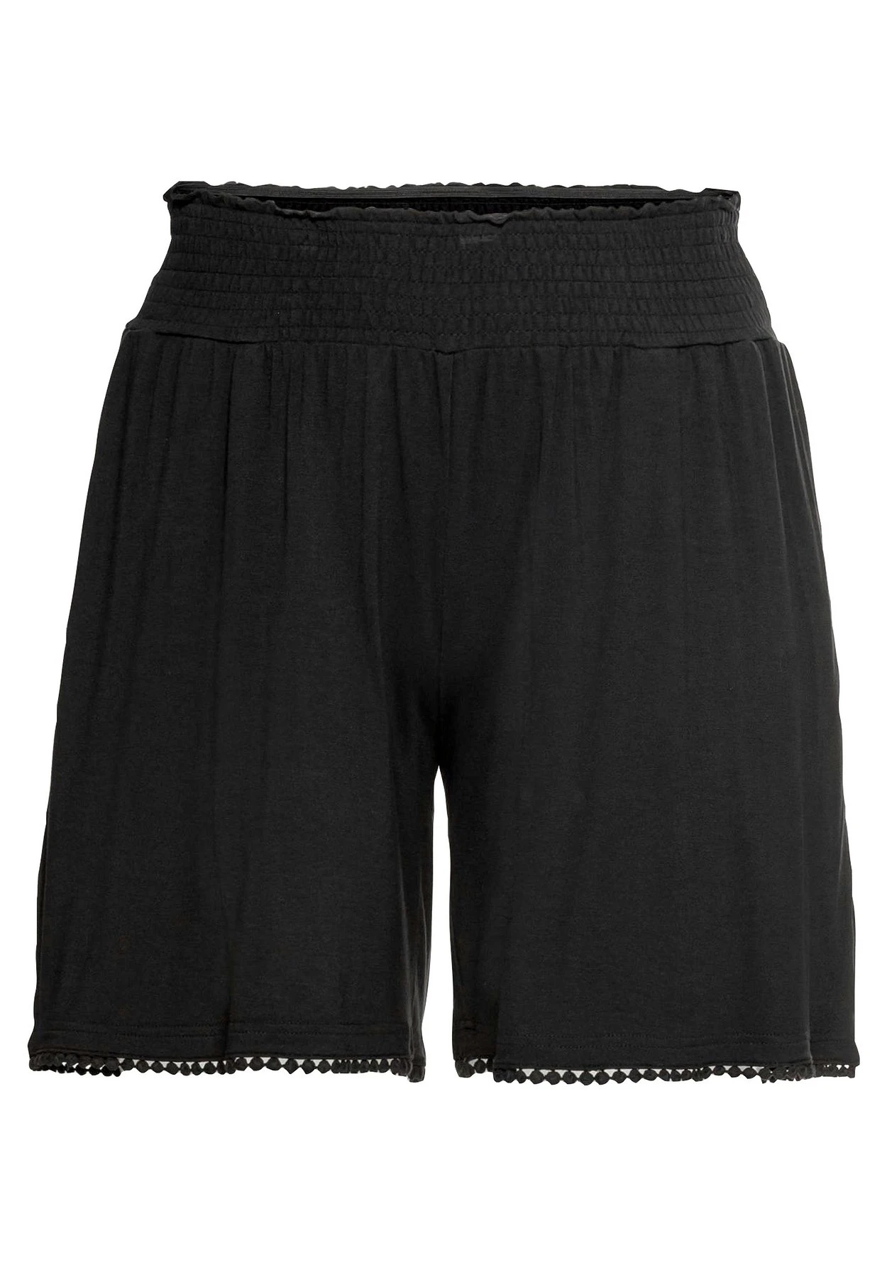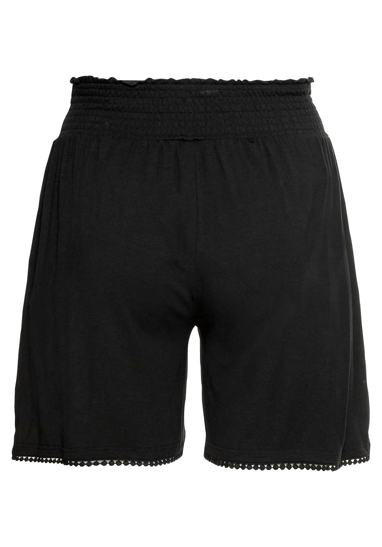 Strandshorts mit weitem Bein. Durch den legeren Schnitt und den bequemen Smokbund eignet sich die kurze Hose optimal, um sie schnell über die Badekleidung zu ziehen. In der Seitennaht befinden sich zwei praktische Engrifftaschen. Die dekorative Häkelspitze am Beinabschluss rundet den Look feminin ab.