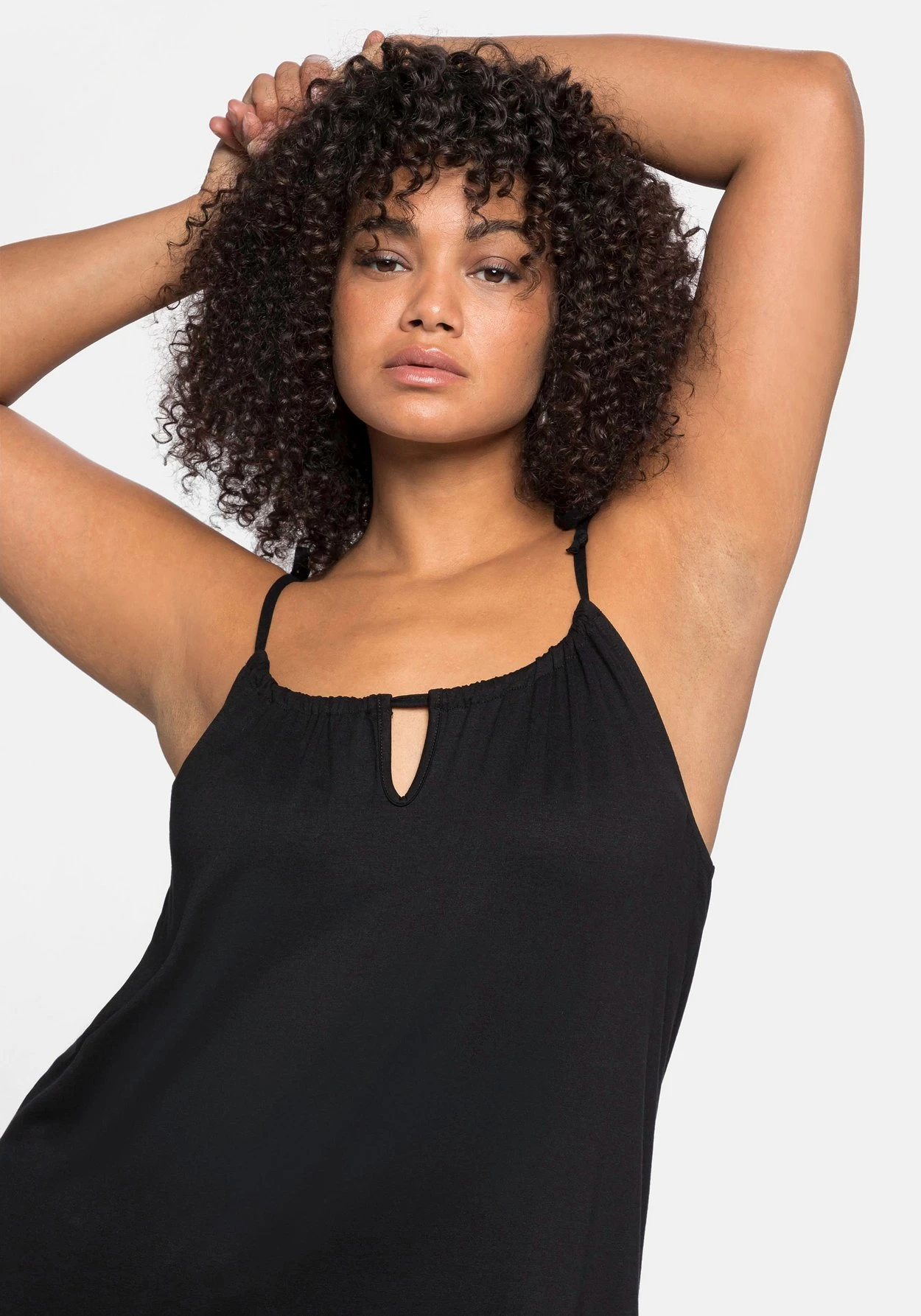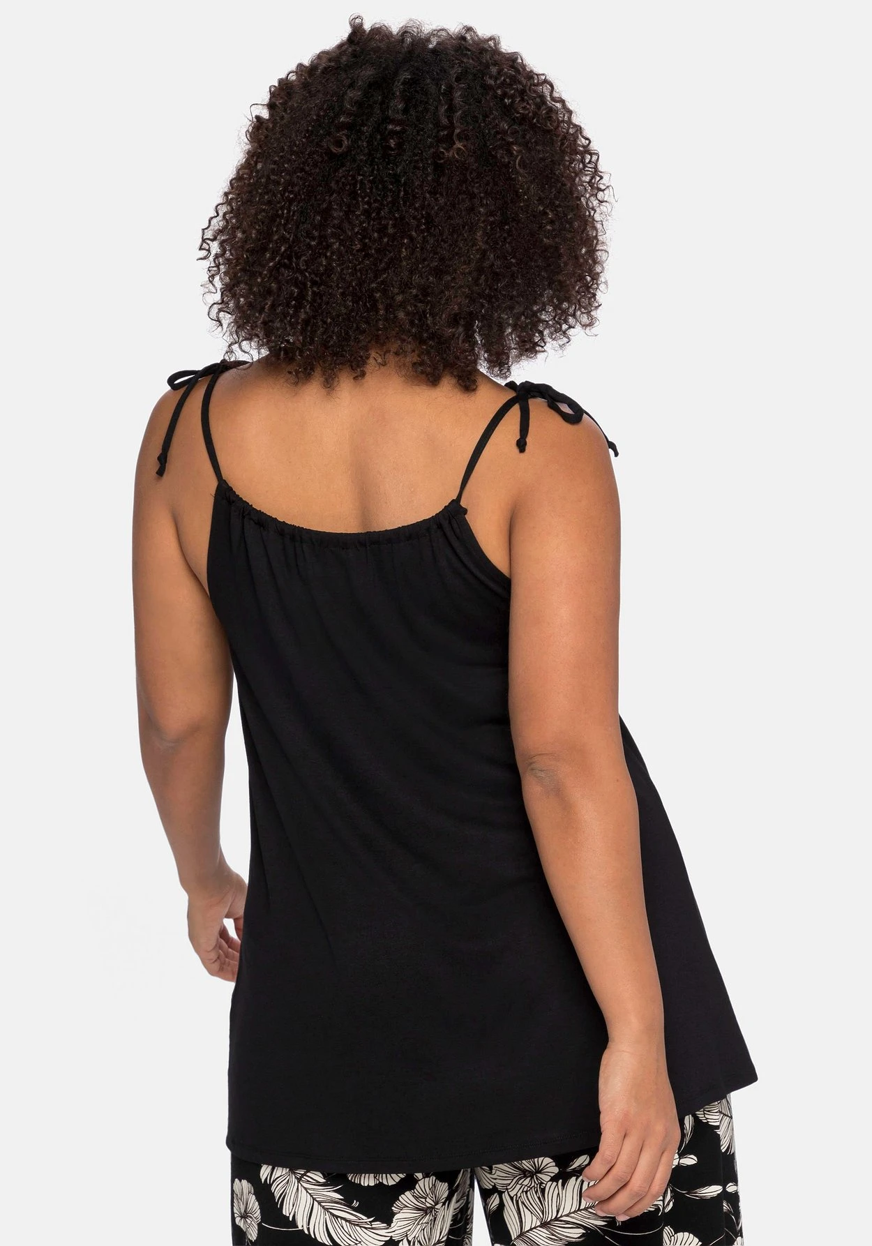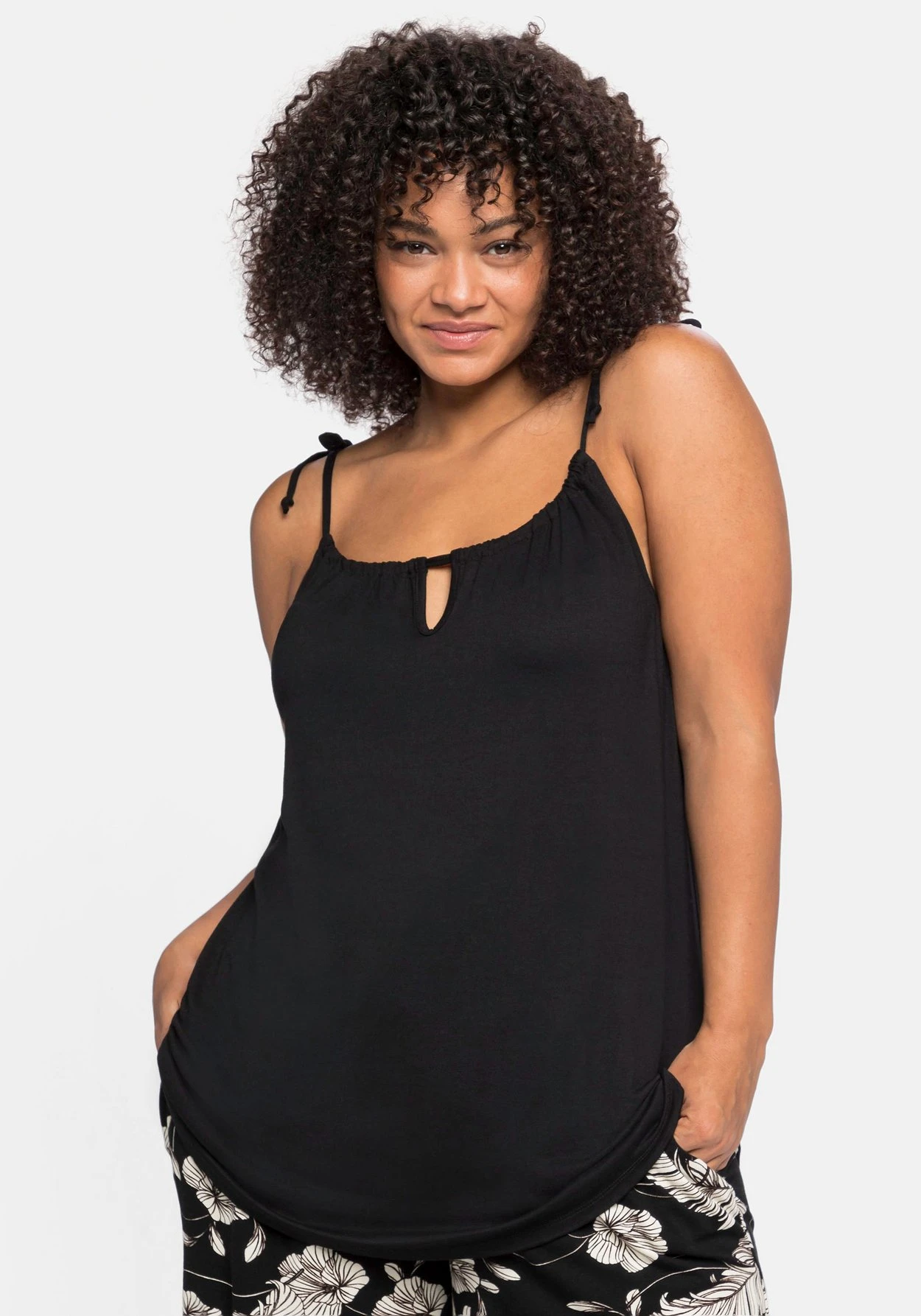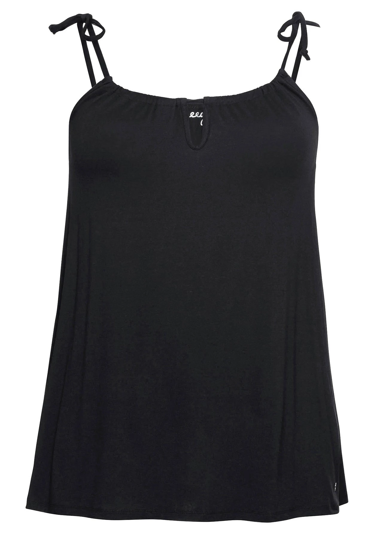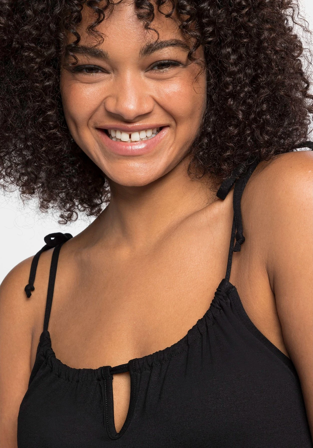 Strandtop mit Spaghettiträgern. Die schmalen Träger können individuell gebunden werden und sorgen so für einen optimalem Sitz am Ausschnitt. Der kleine Cut-out dient als feminines Detail.