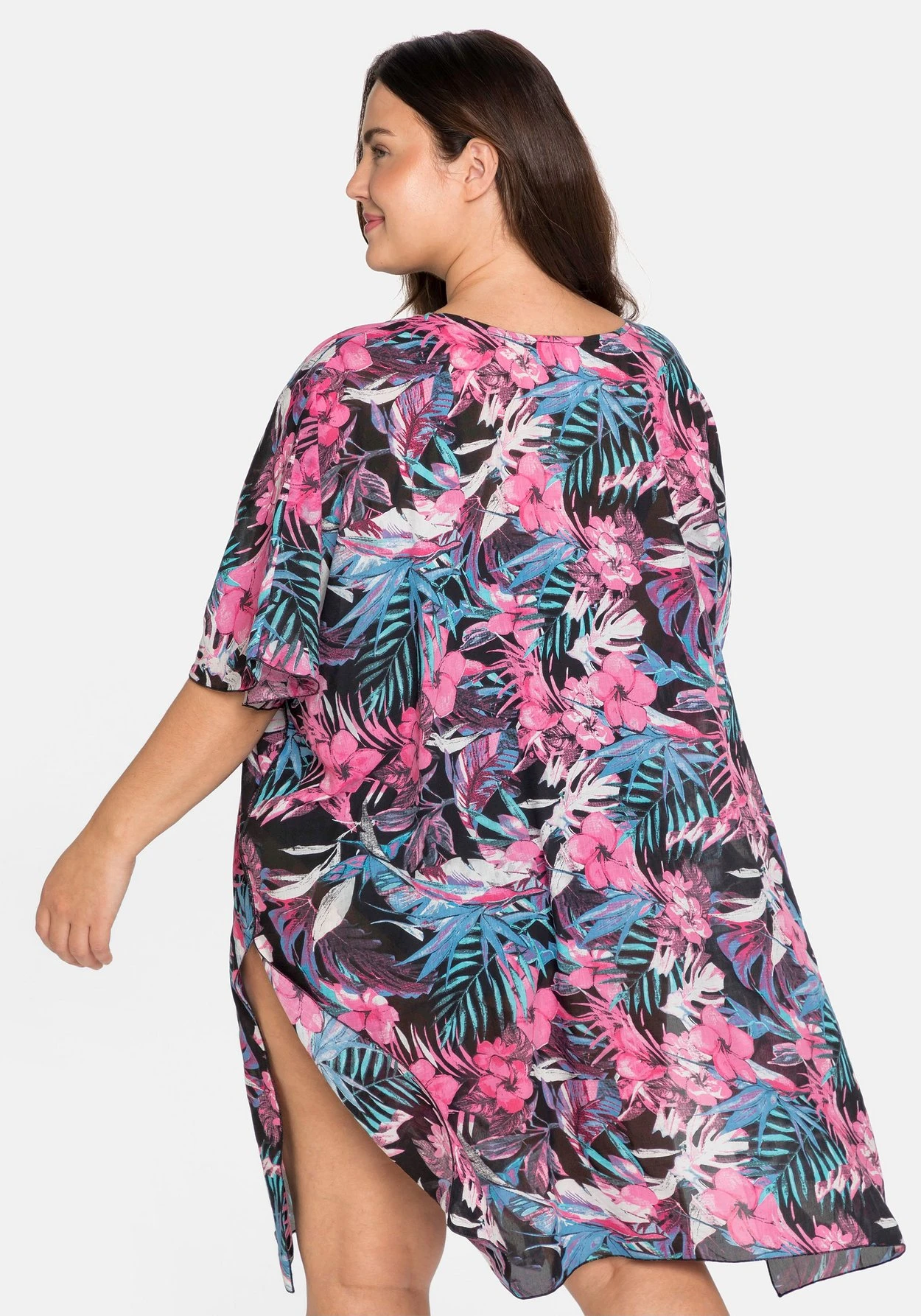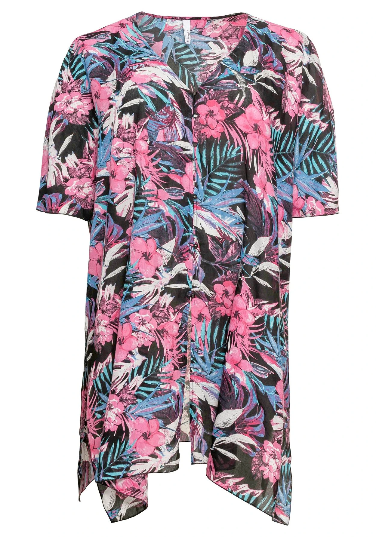 Strandtunika in leichter, transparenter Webqualität. Der luftige Schnitt zeigt sich mit Fledermausärmeln und V-Ausschnitt, für Urlaubsfeeling sorgt der tropische Print. Hohe seitliche Schlitze und eine Knopfleiste runden den Style modisch ab.