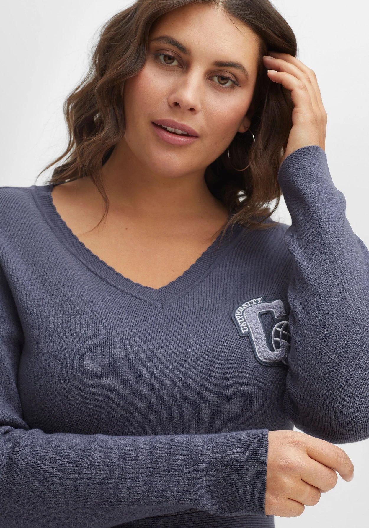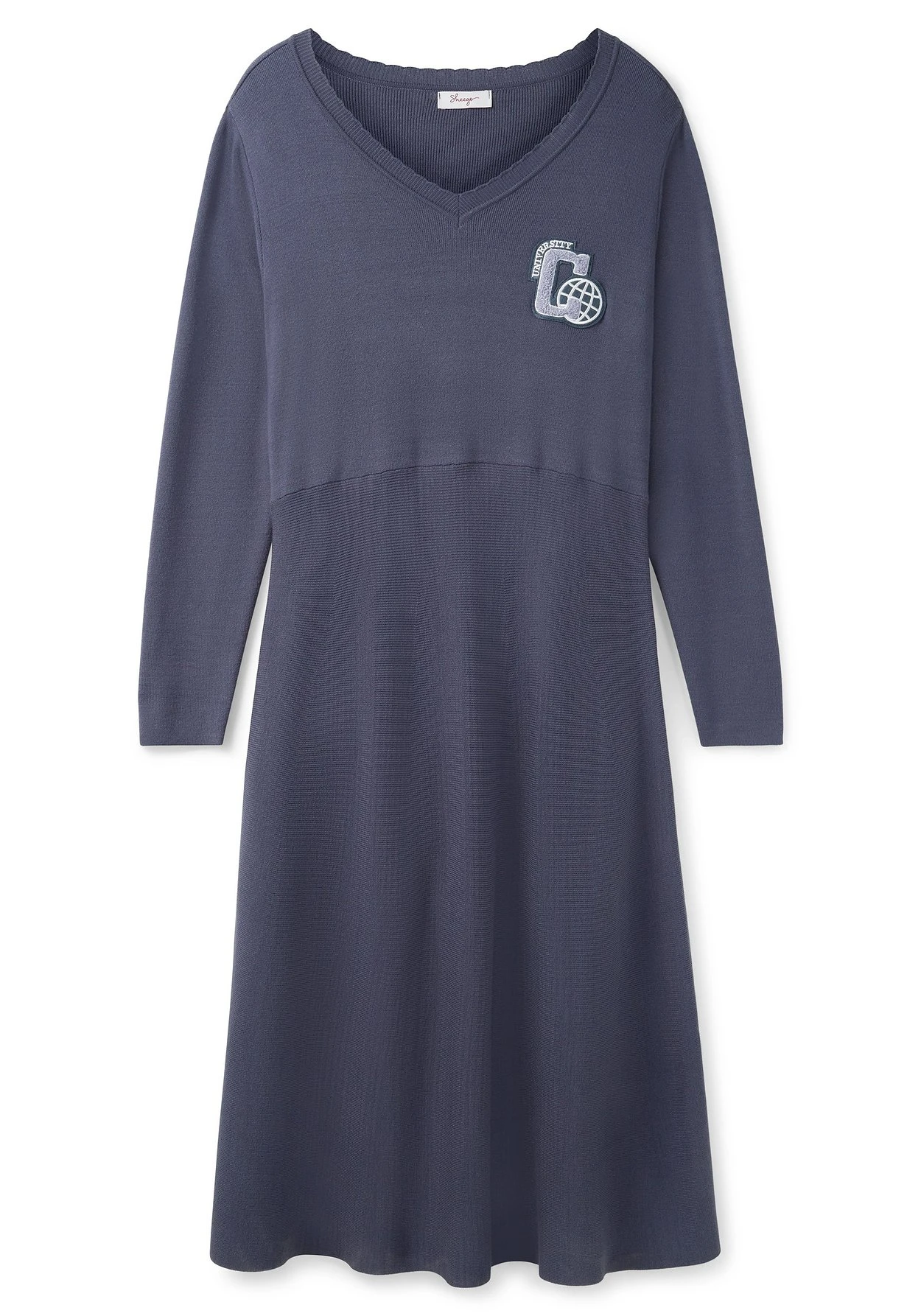 Strickkleid im College-Stil. Mit dem figurbetont geschnittenen Oberteil und dem schwingenden Rock wird das Kleid zu einer femininen Interpretation des sportiven Trends. Den V-Ausschnitt ziert eine hübsche Bogenkante, die Applikation mit Initialen und University-Emblem rundet den angesagten Look perfekt ab.