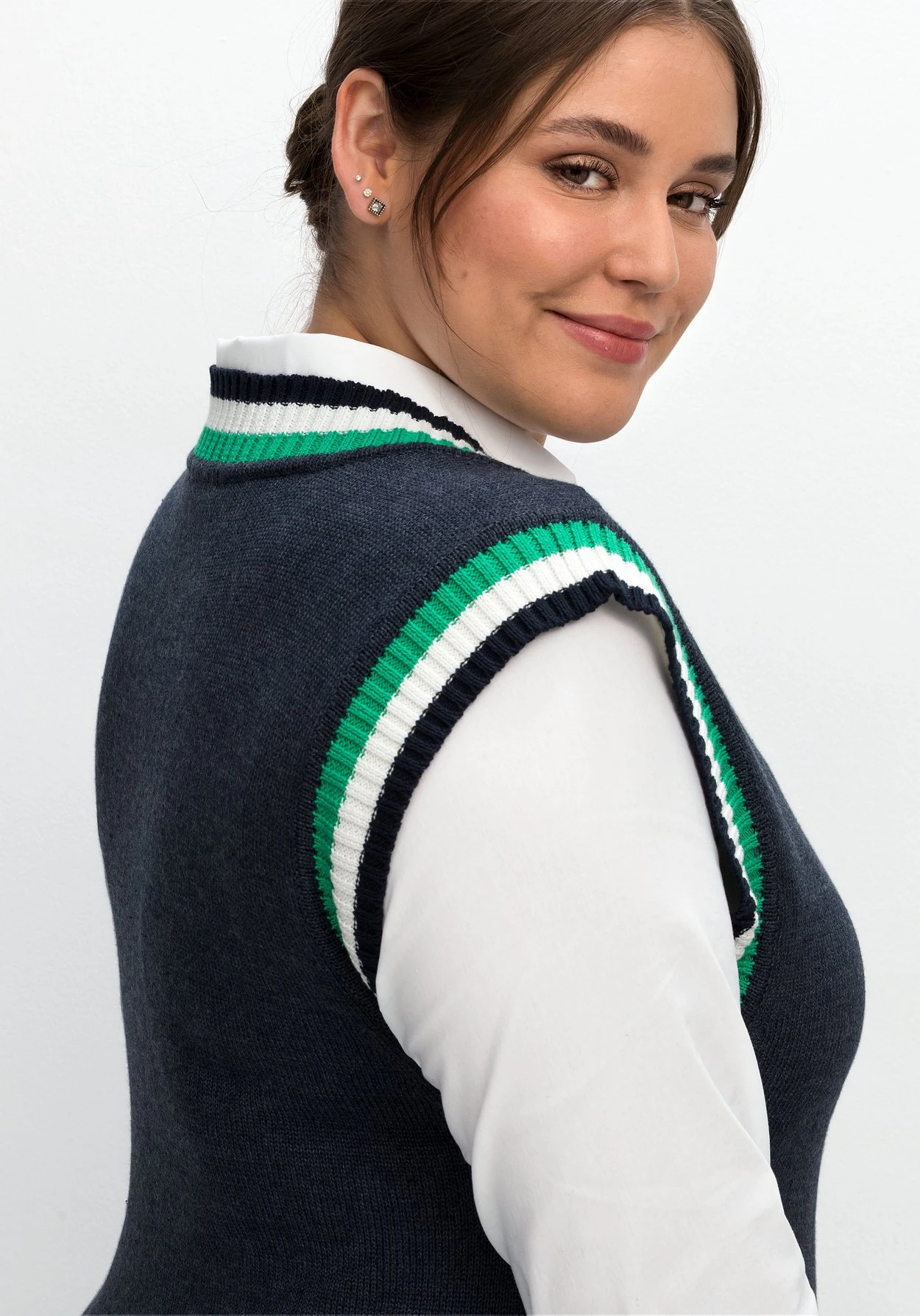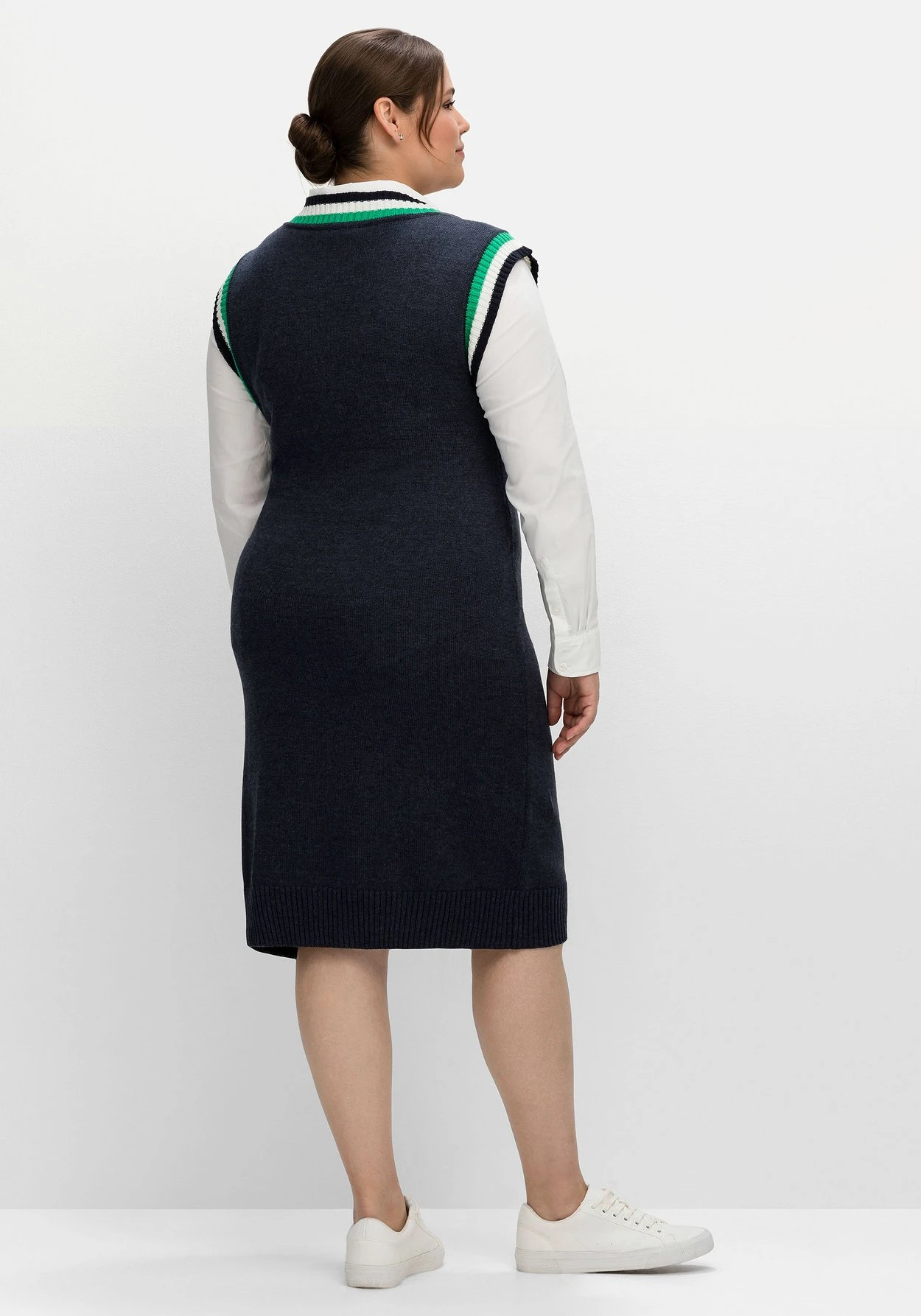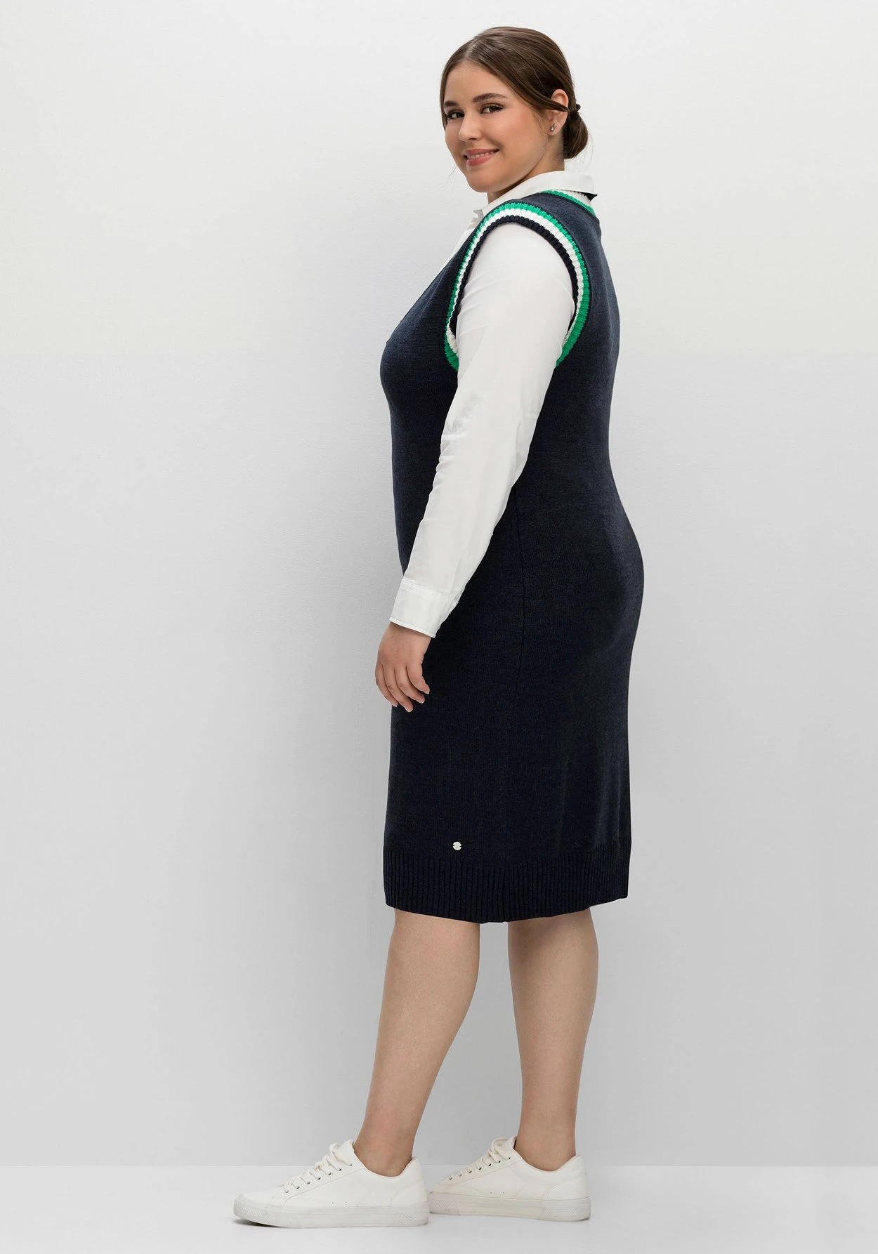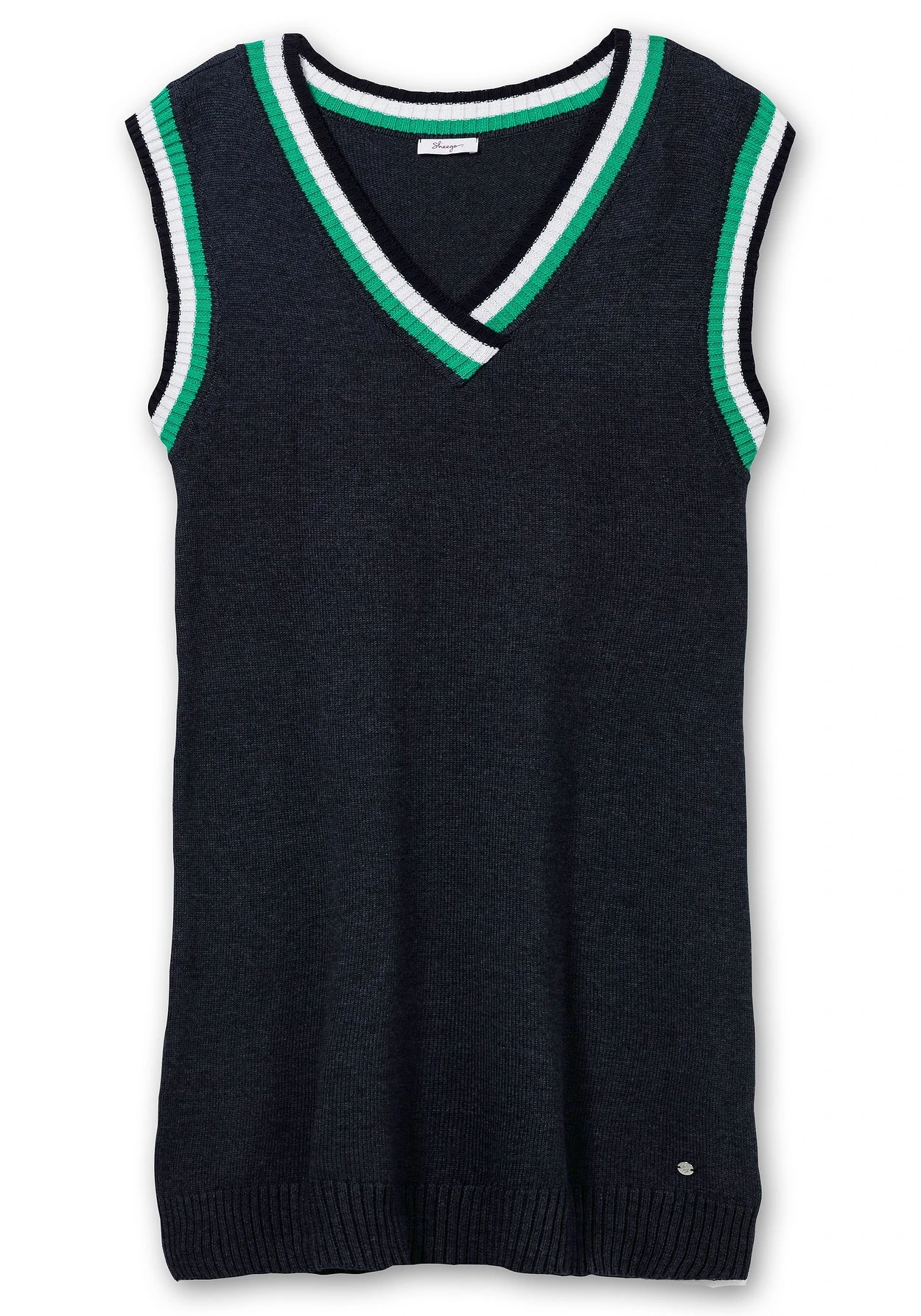 Ärmelloses Strickkleid im Pullunder-Look. Durch den tiefen V-Ausschnitt und die gestreiften Rippbündchen wird der College-Trend hier feminin umgesetzt. Mit einem Langarmshirt kombiniert, wirkt das Kleid sportiv, mit einer schlichten Bluse wird es bürofein.