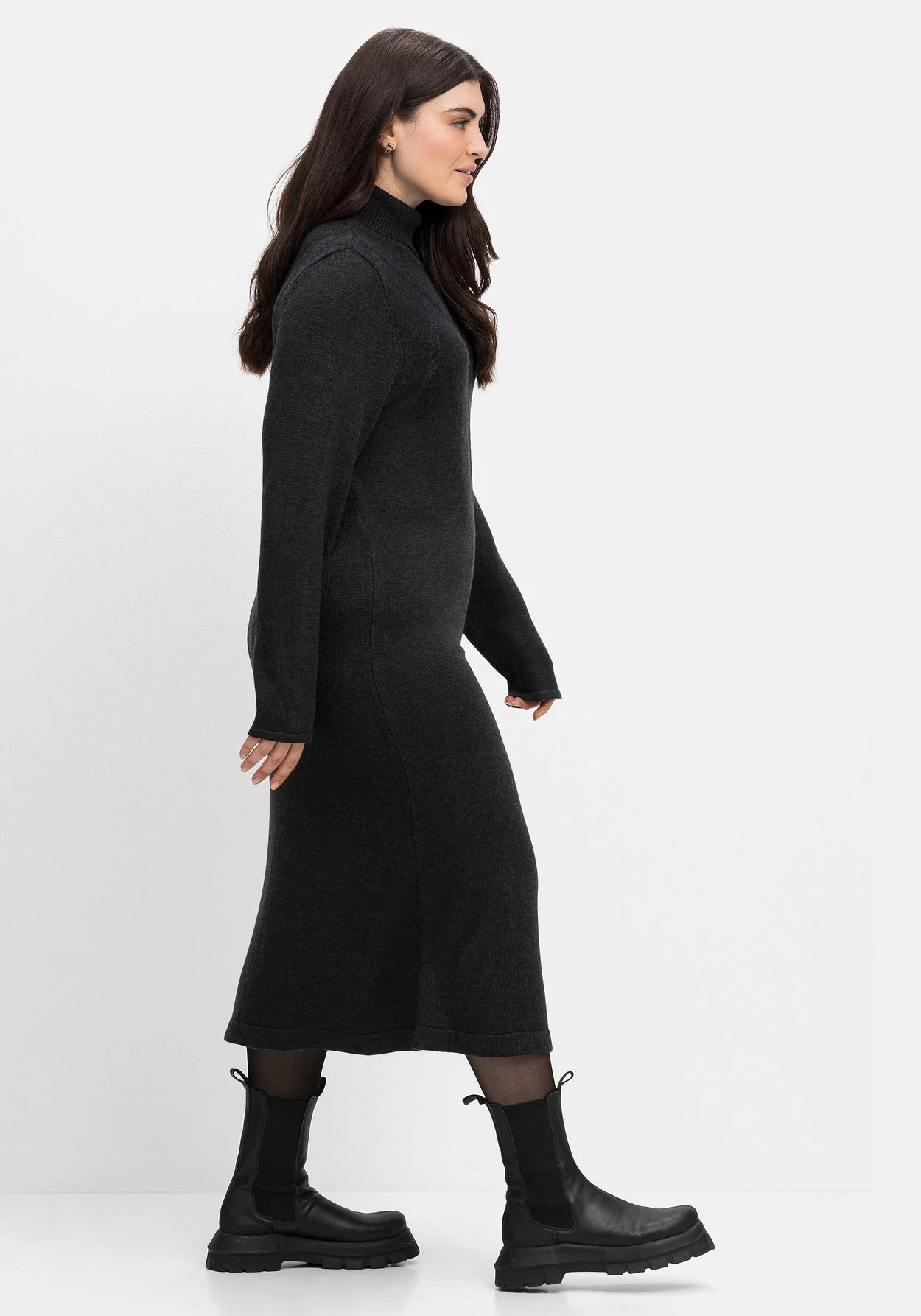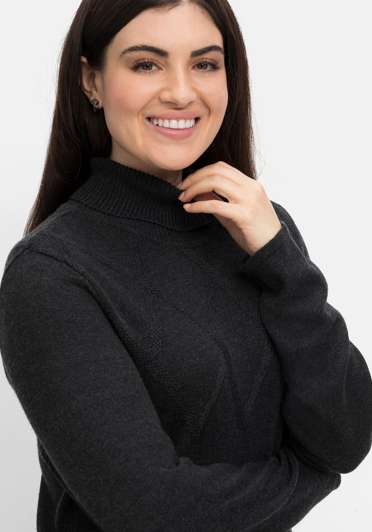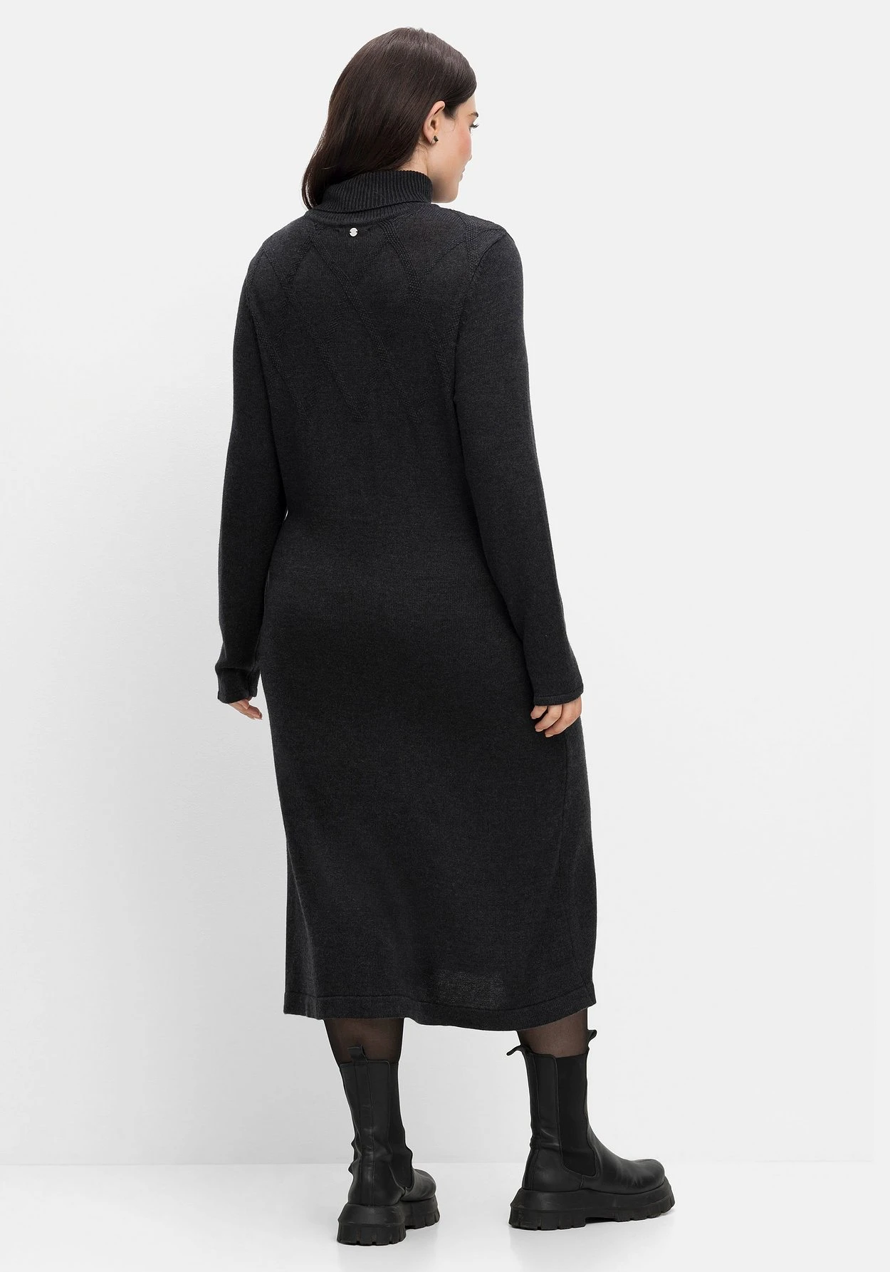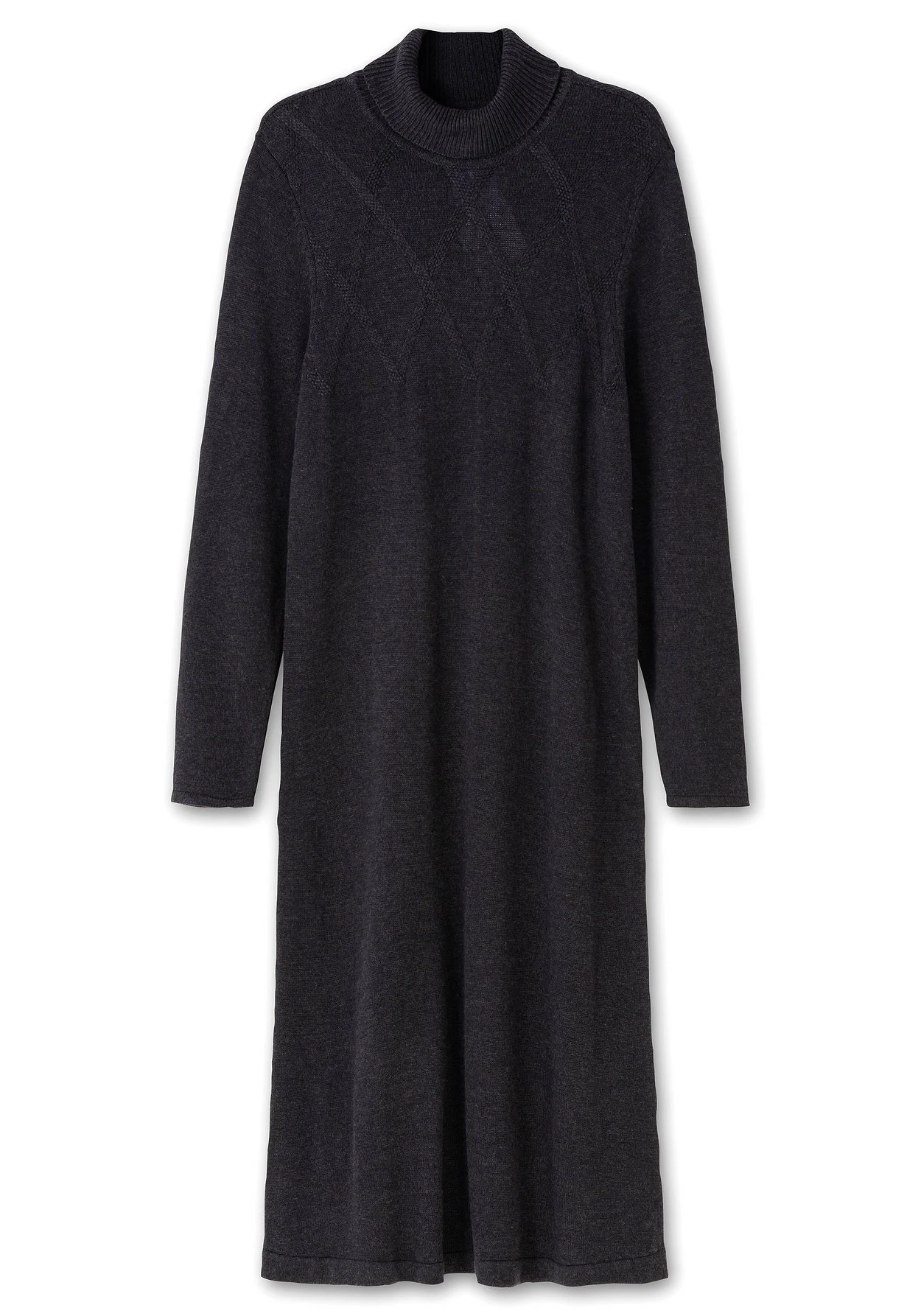 Strickkleid mit Kaschmir. Die hochwertige Strickqualität verwöhnt mit kuscheligem Tragekomfort und trägt sich herrlich weich auf der Haut. Durch den legeren Schnitt im Zusammenspiel mit dem gestrickten, tonigen Rautenmuster erhält das Kleid sportive Lässigkeit. Dazu umschließt der hohe Rollkragen sanft den Hals und hält schön warm.