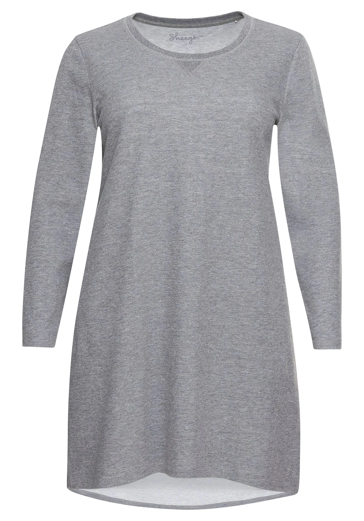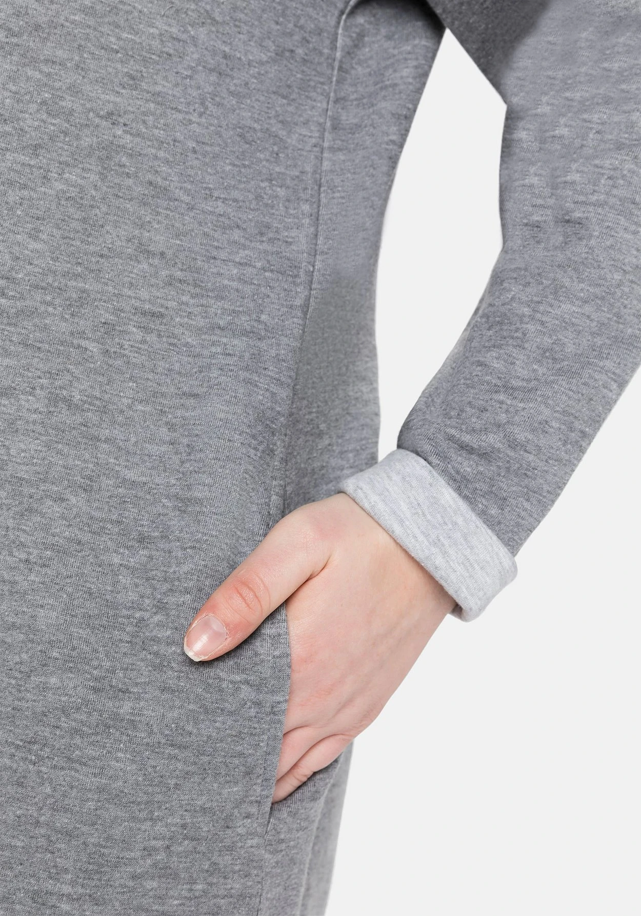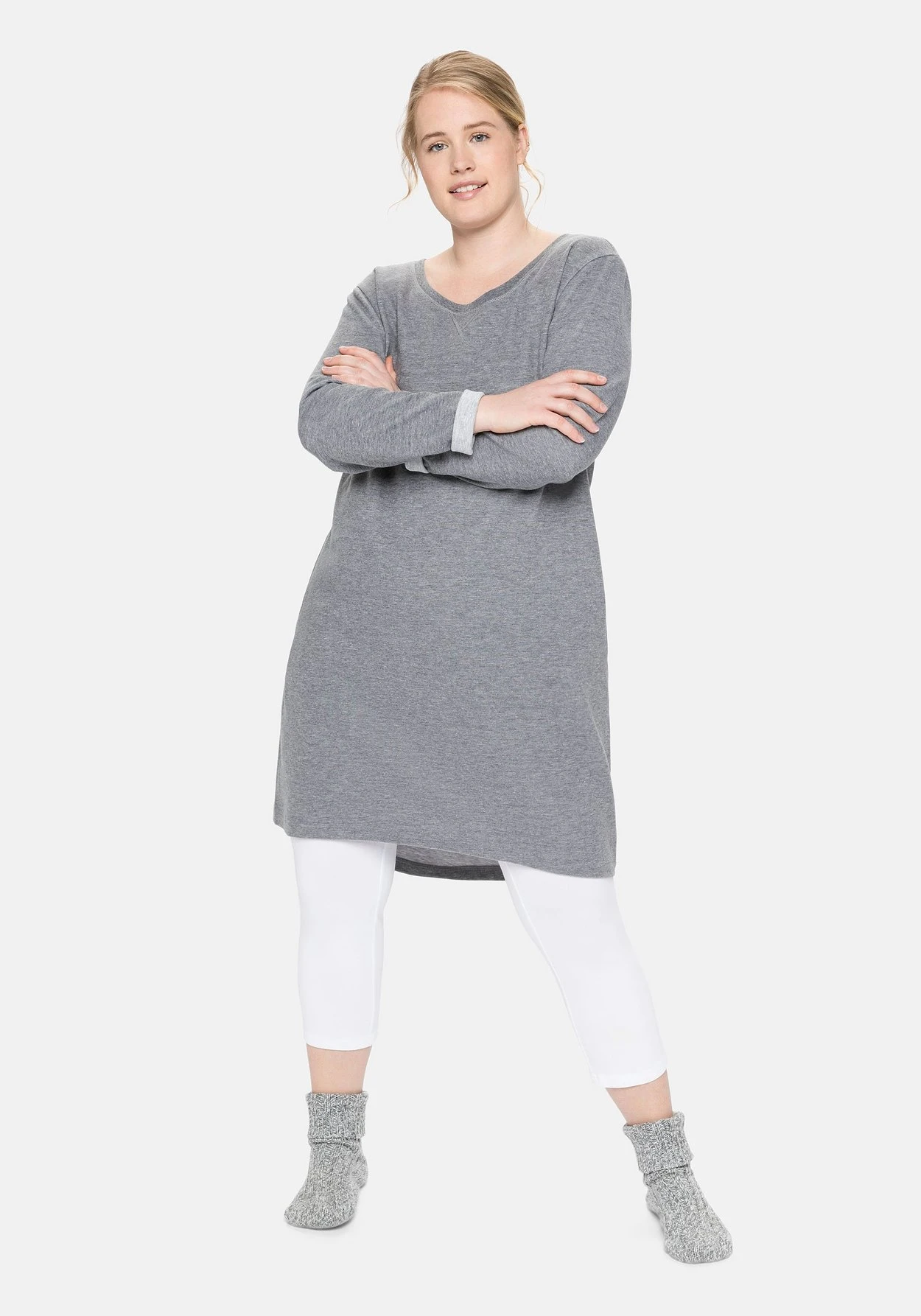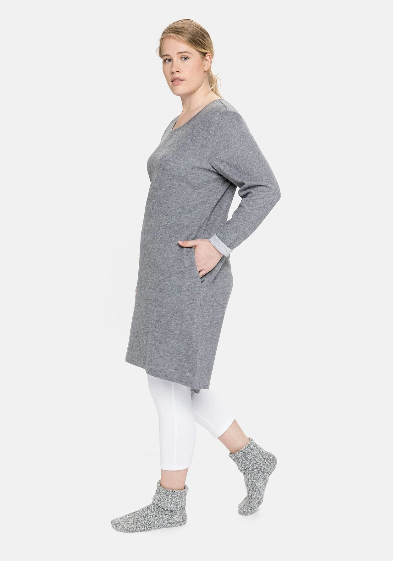 Sweatkleid in Double-Face-Verarbeitung. Die kontrastfarbene Innenseite wird durch die dekorativen Steppnähte modisch ergänzt. Für besondere Lässigkeit sorgt der Saum, der vorn ca. 10 cm kürzer und leicht gerundet ist. Dazu kommen zwei seitliche Eingrifftaschen und der Rundhalsausschnitt – fertig ist der sportive Wohlfühl-Look.
