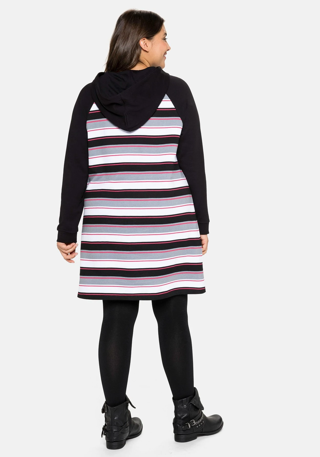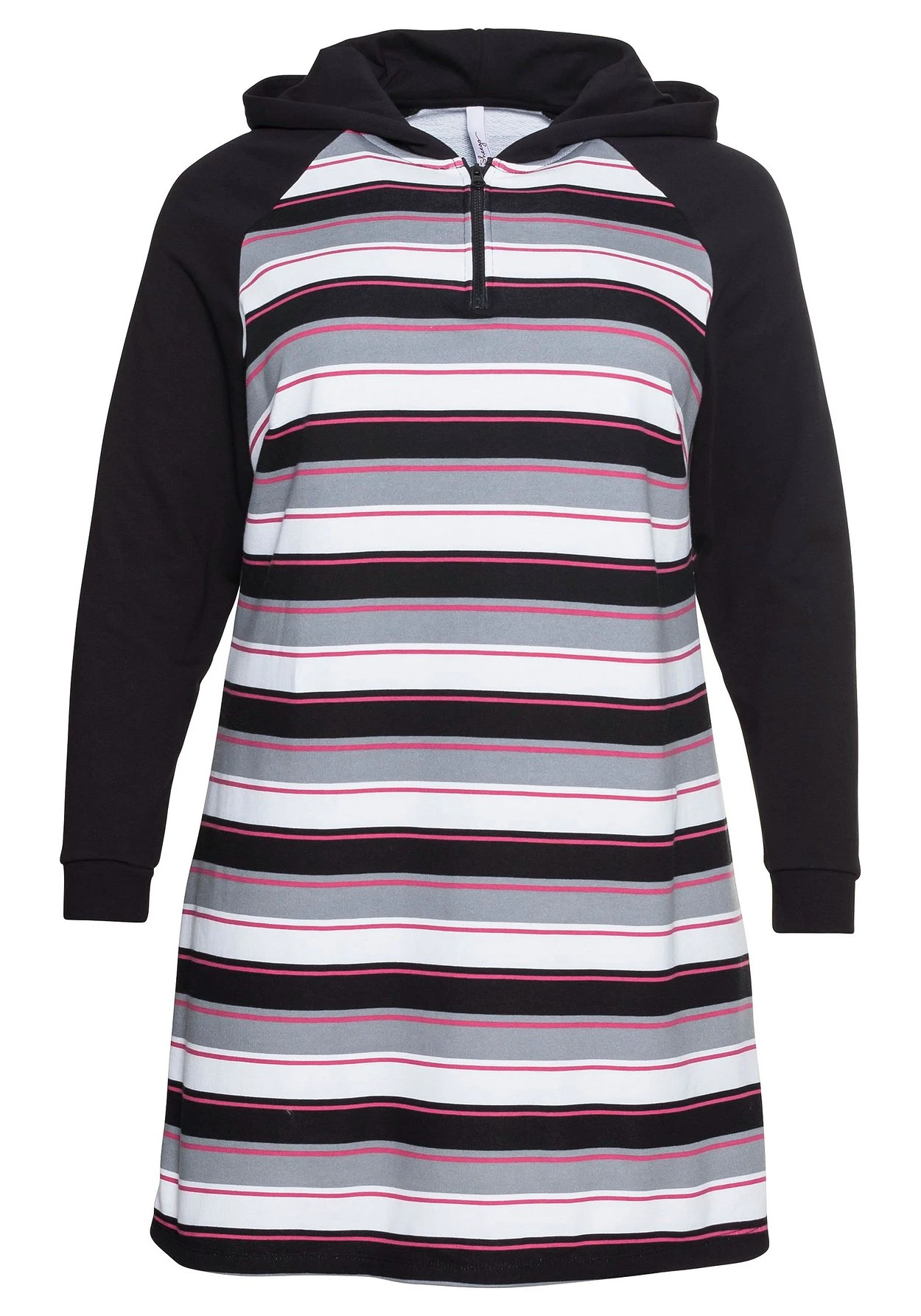 Sweatkleid mit Kapuze. Der Reißverschluss am Rundhalsausschnitt vergrößert nach Bedarf den Ausschnitt und ermöglicht gleichzeitig einen leichteren Einstieg. Während die langen Ärmel schlicht unifarben gehalten sind, zeigt sich der Body im sportiven Streifen-Design.