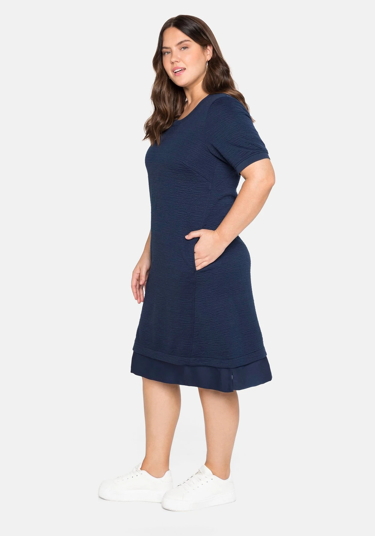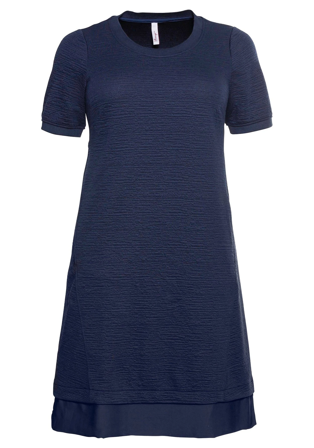 Sweatkleid mit Rippbündchen am Rundhalsausschnitt und Ärmelsaum. Der leicht glänzende Satineinsatz am Saum sorgt für einen raffinierten Layeringeffekt. Vorn befinden sich zwei praktische Eingrifftaschen, Nähte vorn und hinten strecken die Silhouette optisch.