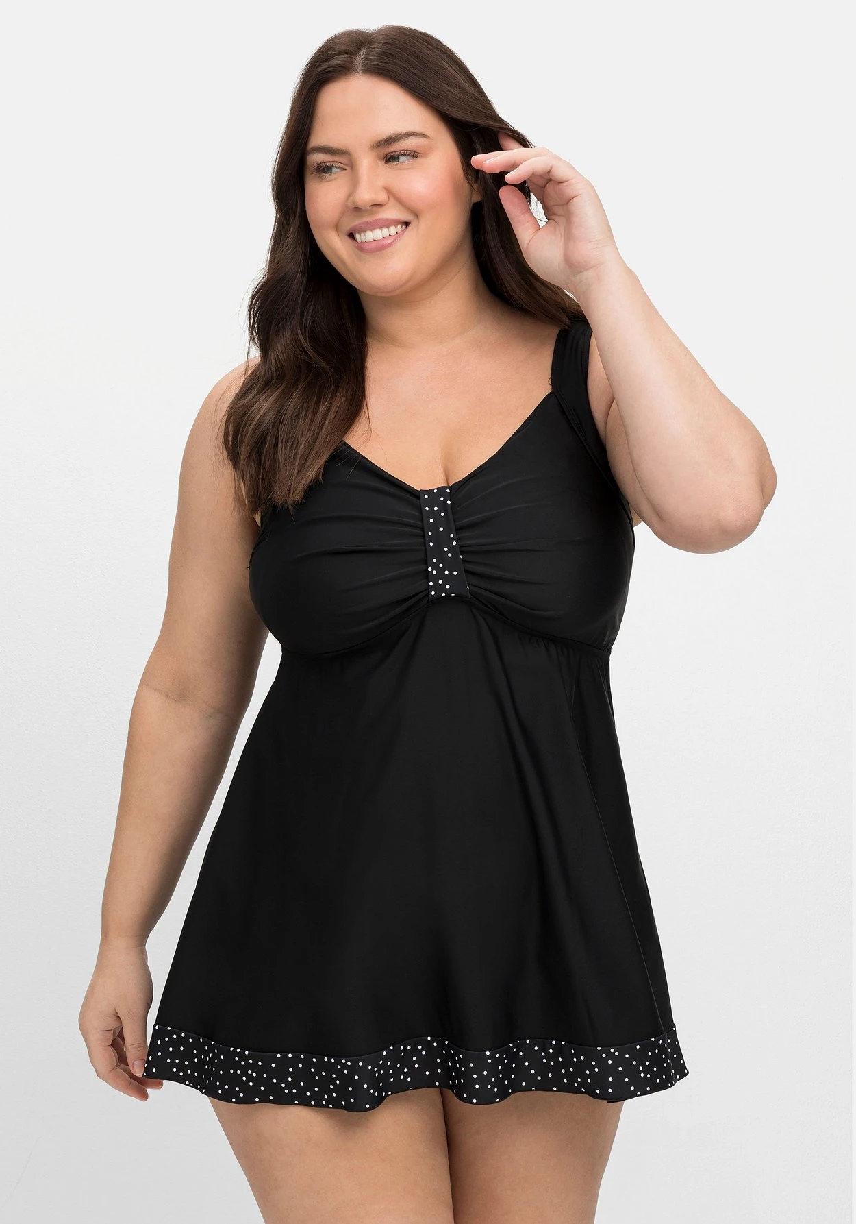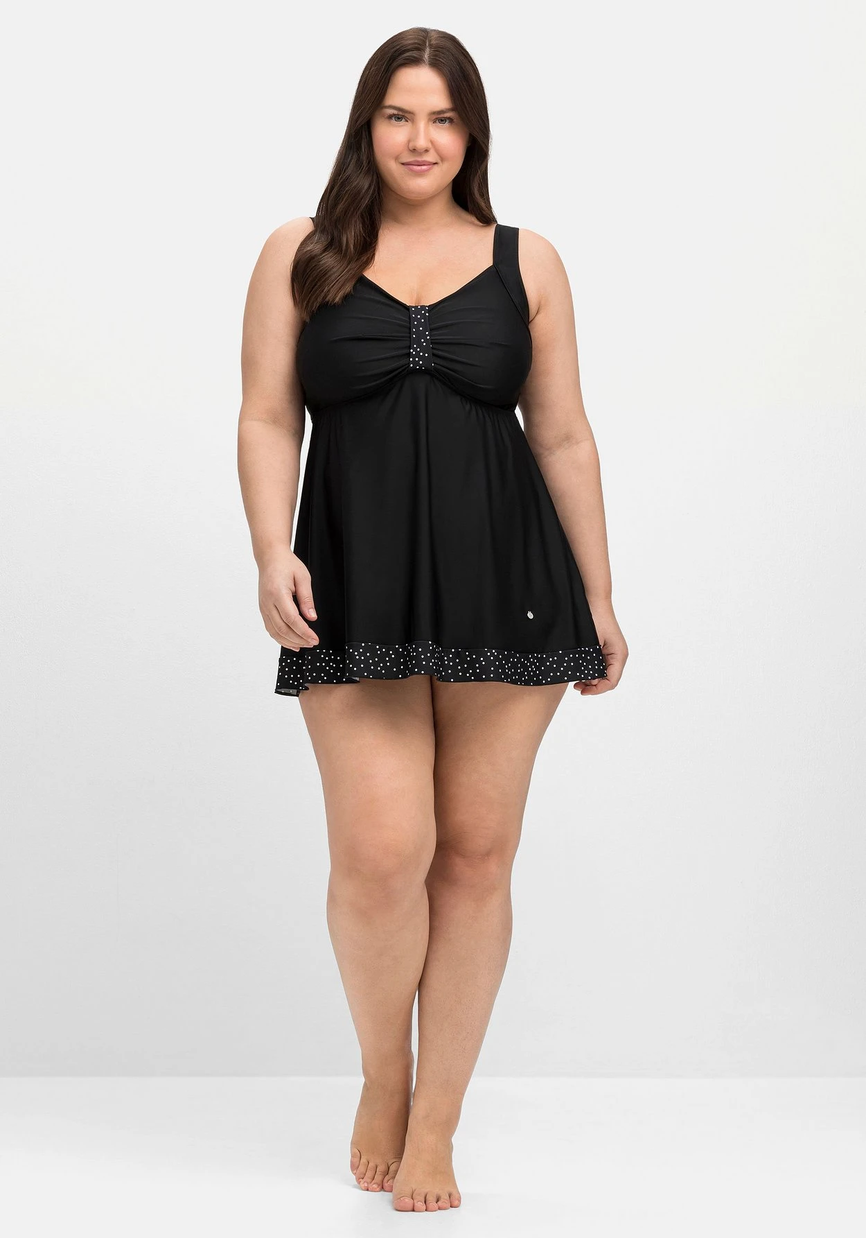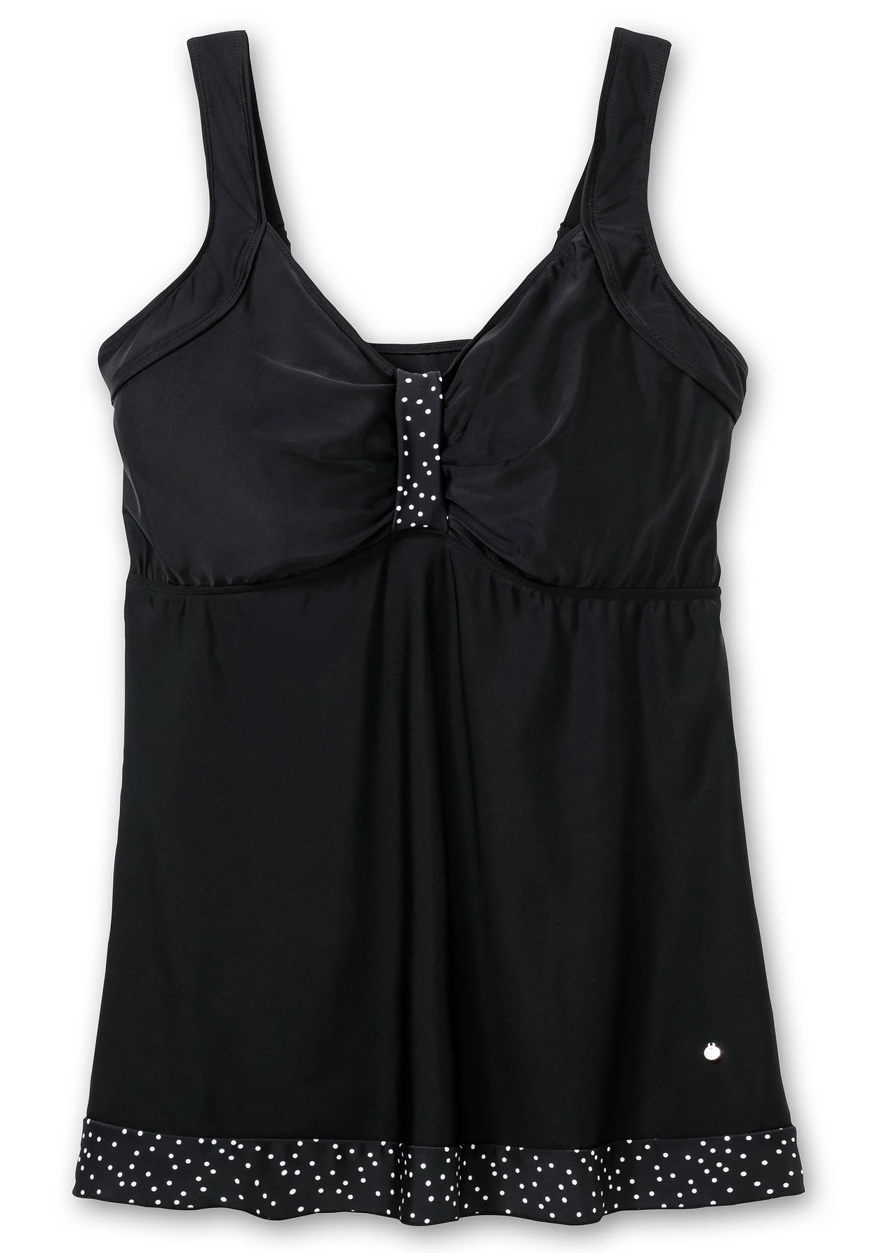 Tankini-Oberteil mit zartem Pünktchenprint. Der längere, nach unten hin ausgestellte Schnitt sorgt in Kombination mit der Raffung vorn für eine feminine Silhouette. Wattierte Softcups und das Unterbrustgummi geben der Brust Form, breite verstellbare Träger unterstreichen den Tragekomfort. Dank des Mix & Match-Charakters lassen sich dazu verschiedene Hosen aus der sheego Badekollektion kombinieren.