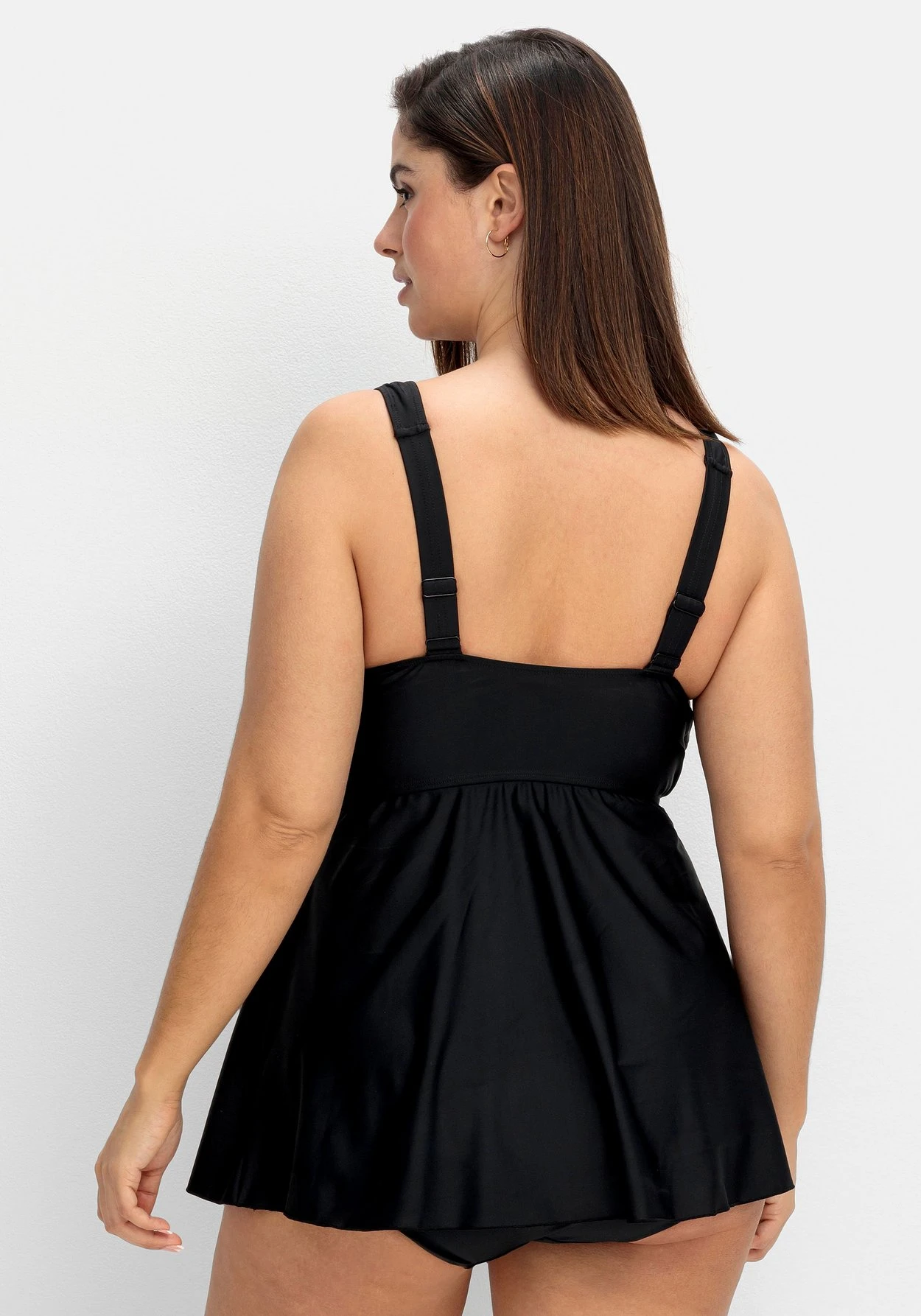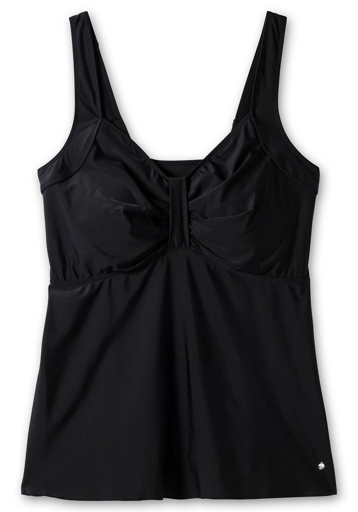 Tankini-Oberteil in leicht ausgestellter Form. Der längere, nach unten hin ausgestellte Schnitt sorgt in Kombination mit der Raffung vorn für eine feminine Silhouette. Wattierte Softcups und das Unterbrustgummi geben der Brust Form, breite verstellbare Träger unterstreichen den Tragekomfort. Dank des Mix & Match-Charakters lassen sich dazu verschiedene Hosen aus der sheego Badekollektion kombinieren.