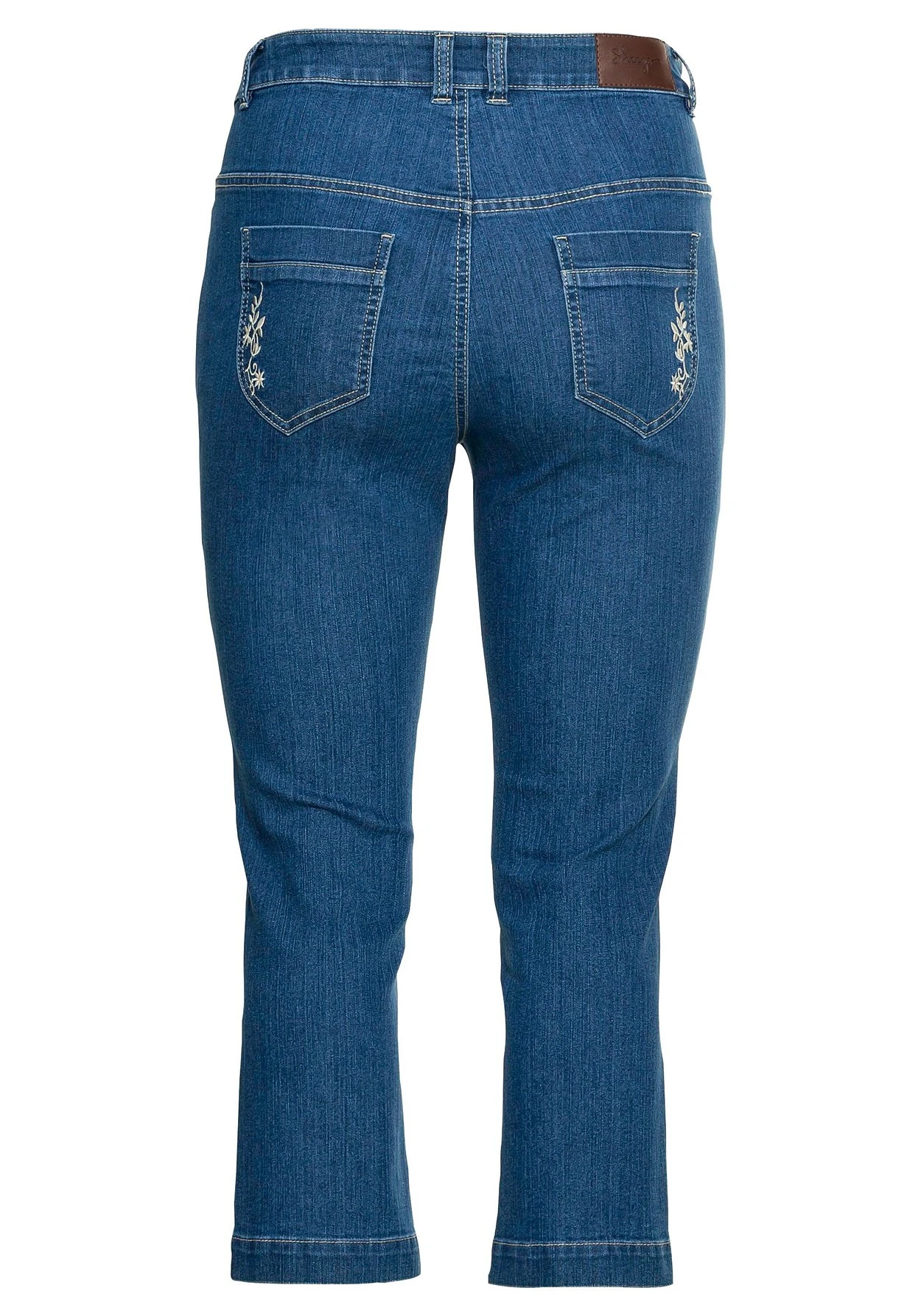 7/8-Jeans im Trachtenlook. Für Oktoberfest-Charme sorgt der Latz vorn, der durch rustikale Knöpfe und Stickereien ins Auge fällt. Ansonsten besitzt die Jeans eine individuelle Waschung und kontrastfarbene Nähte. Der Formbund ist mit Gürtelschlaufen, Knopf und Reißverschluss gearbeitet.