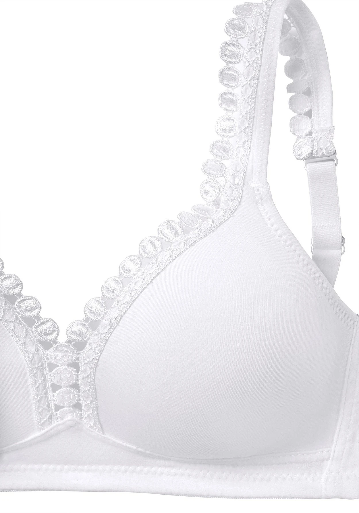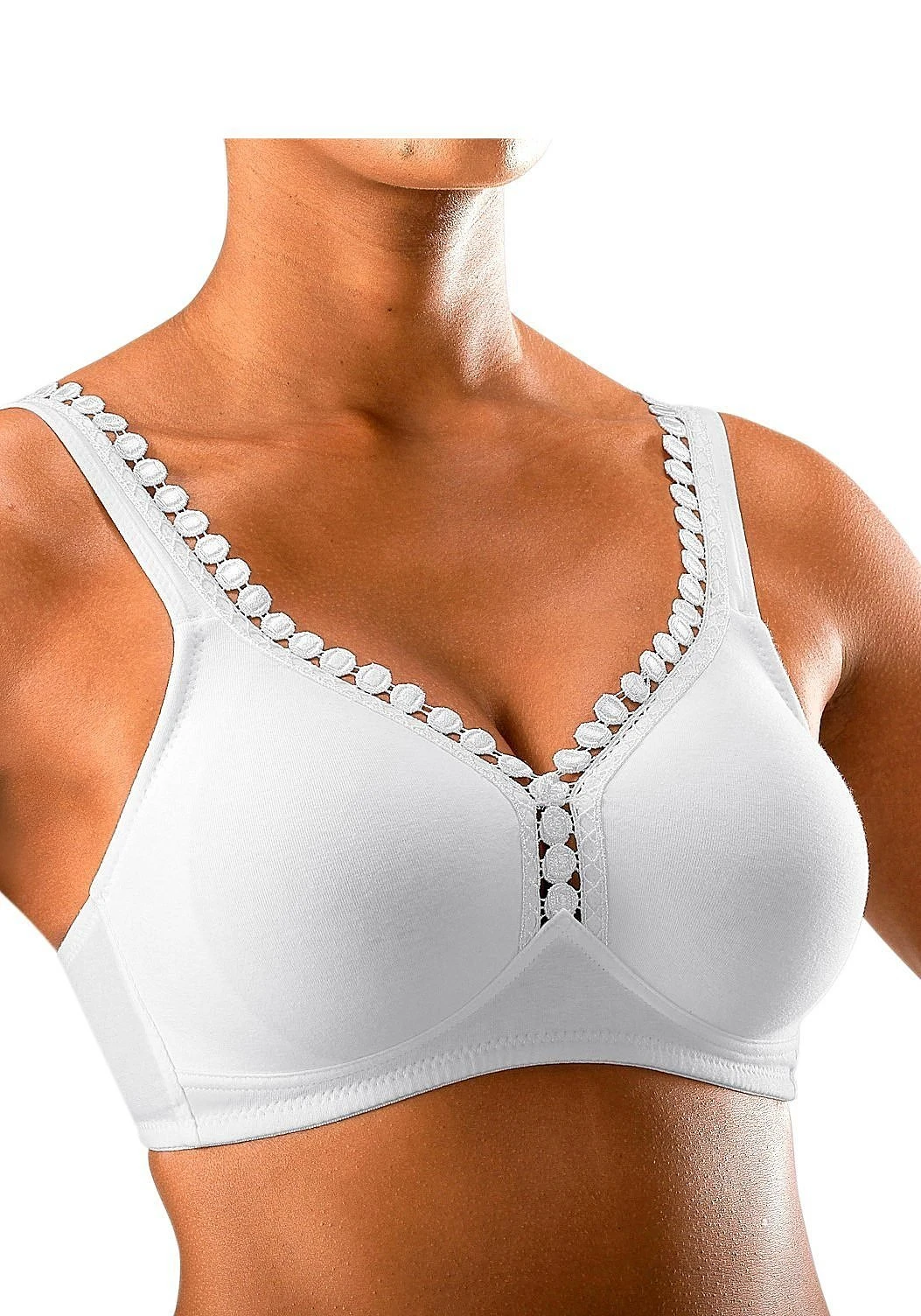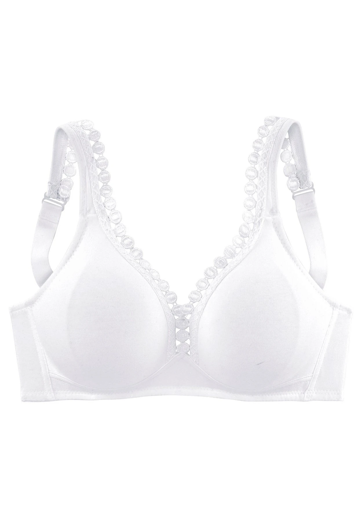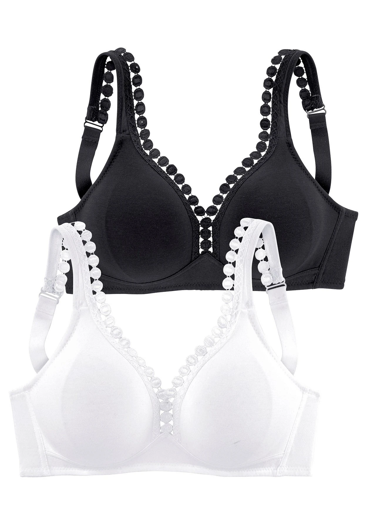 PETITE FLEUR: BH ohne Bügel im 2er-Pack. Nahtlos vorgeformte Cups. Hübsche Zierkante am Dekolleté. Träger und Rückenverschluss verstellbar. Klassische Dessous. Bequeme Alltags-Dessous. Modische Dessous. Aus 80% Baumwolle, 15% Viskose, 5% Elasthan. BHs sind nicht trocknergeeignet, da die Versteller und Ringe durch die Hitze beschädigt werden und brechen.