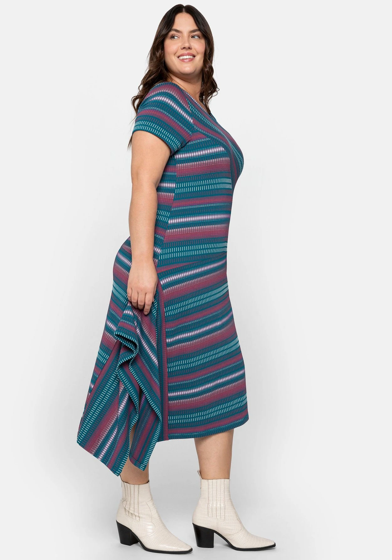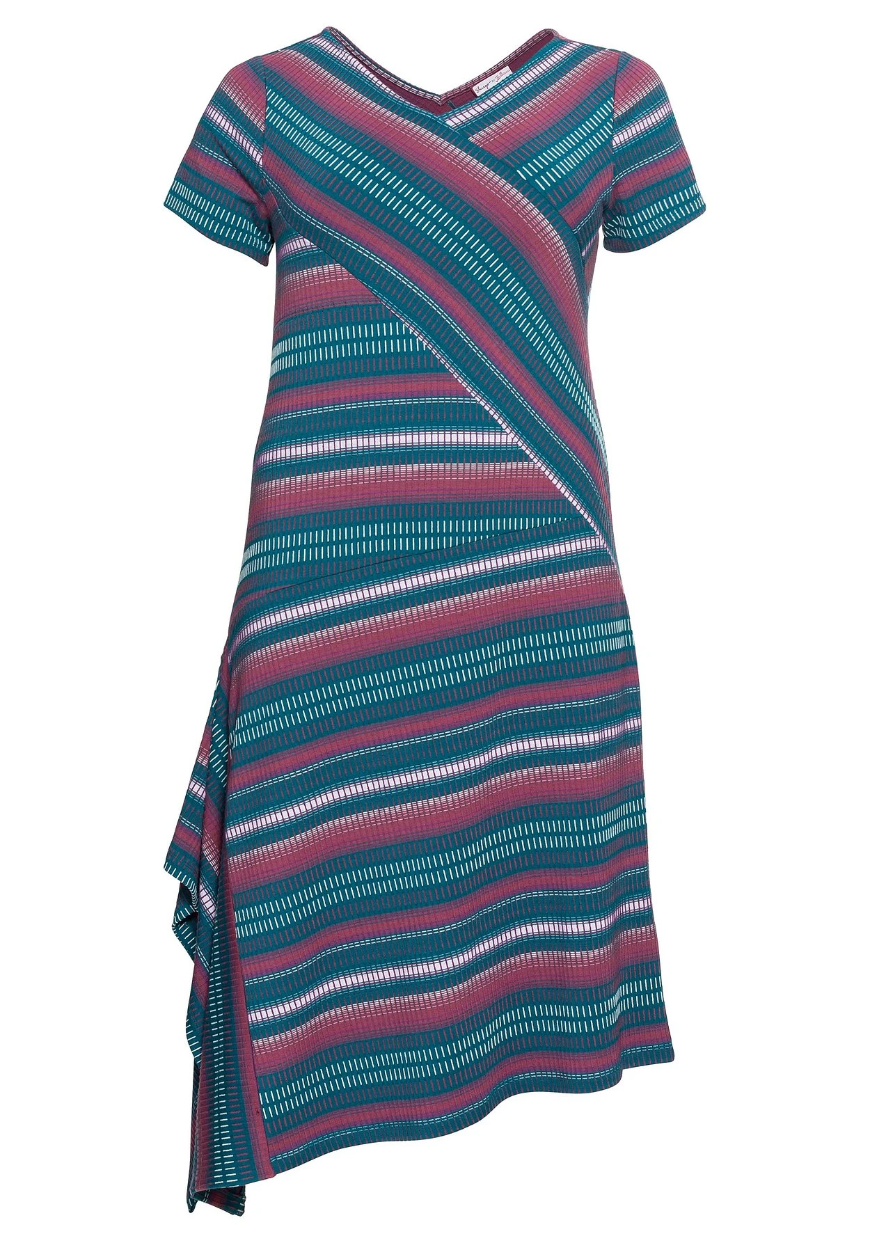 Strickkleid in Midilänge von sheego by Joe Browns. Für die raffinierte Wirkung sorgt das gekreuzt gelegte Vorderteil, das vorn und hinten einen streckenden V-Ausschnitt entstehen lässt. Die unterschiedlich laufenden, verschiedenfarbigen Streifen unterstreichen den Wickel-Effekt zusätzlich. Auch der zipfelig geschnittene Rock greift den asymmetrischen Look perfekt auf. Die verschlusslose Schlupfform macht das Kleid so tragekomfortabel.