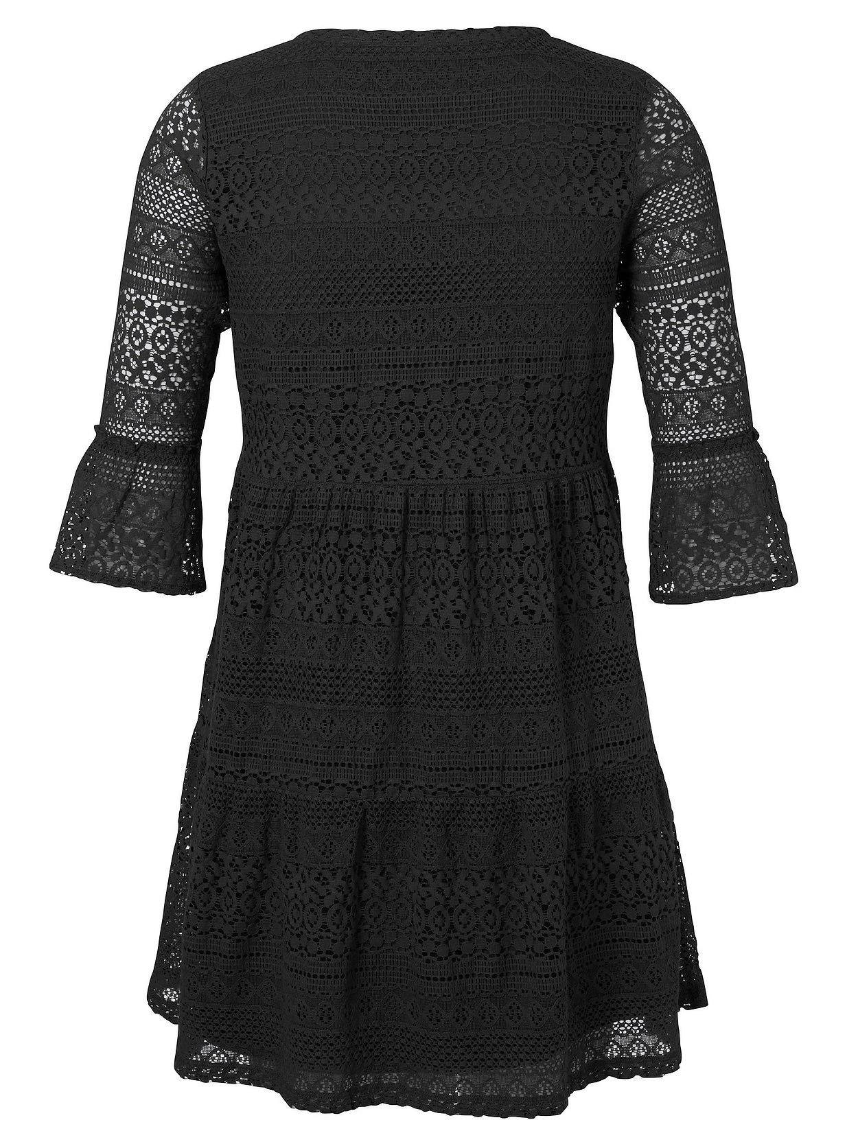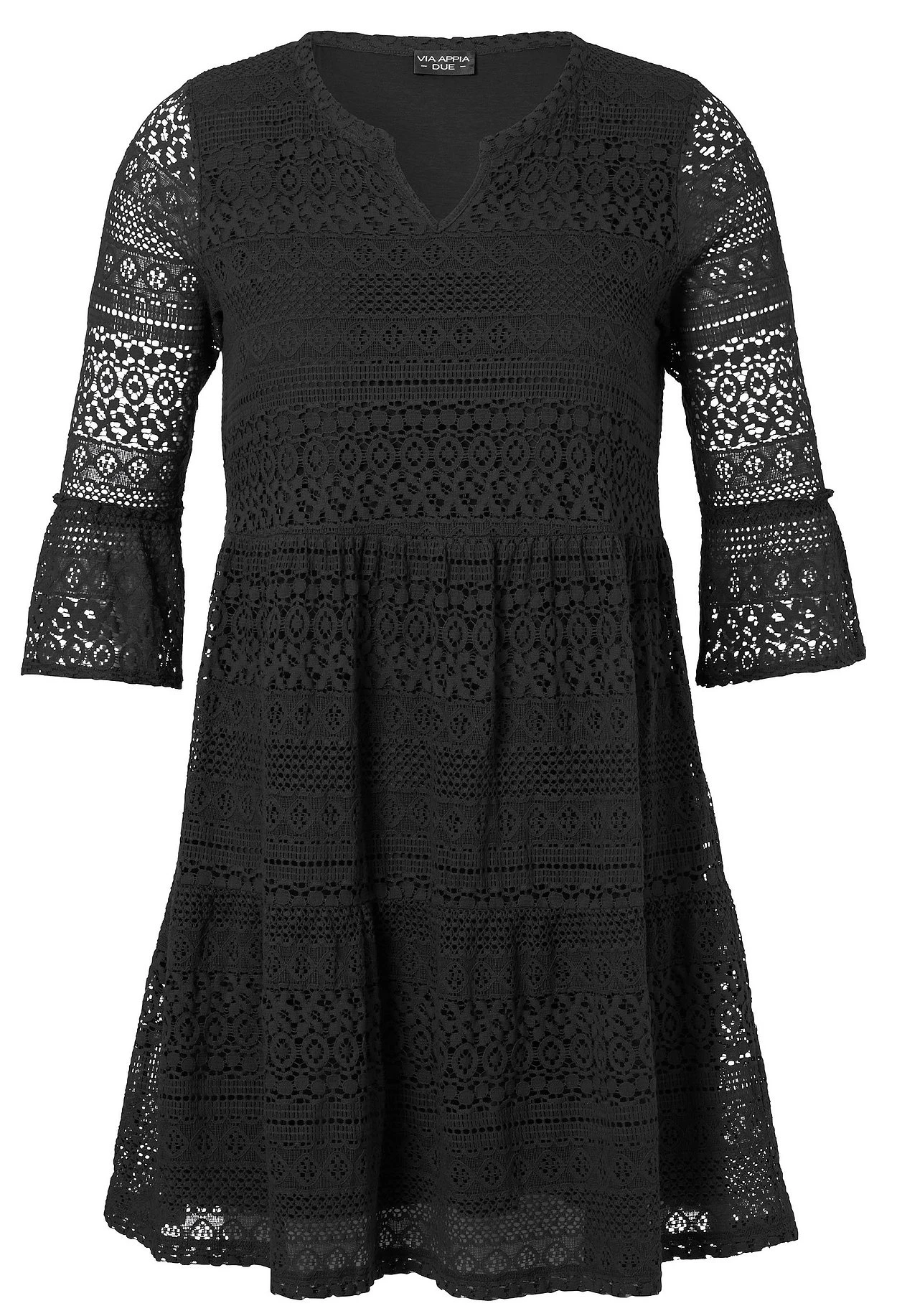 Kleid von VIA APPIA DUE. Der Mix aus zarter Spitze und luftigem Lochmuster sorgt hier für eine feminine, sommerliche Optik. Der Ärmel lässt dezent die Haut durchschimmern, die doppelte Verarbeitung am Body macht das Kleid blickdicht. Der Ausschnitt ist mit einem V-Cut gearbeitet, die 3/4-langen Ärmel sind nach unten hin ausgestellt. Eine Teilungsnaht auf Taillenhöhe gibt der Silhouette Form, der stufig fallende Rock umspielt locker die Beine.