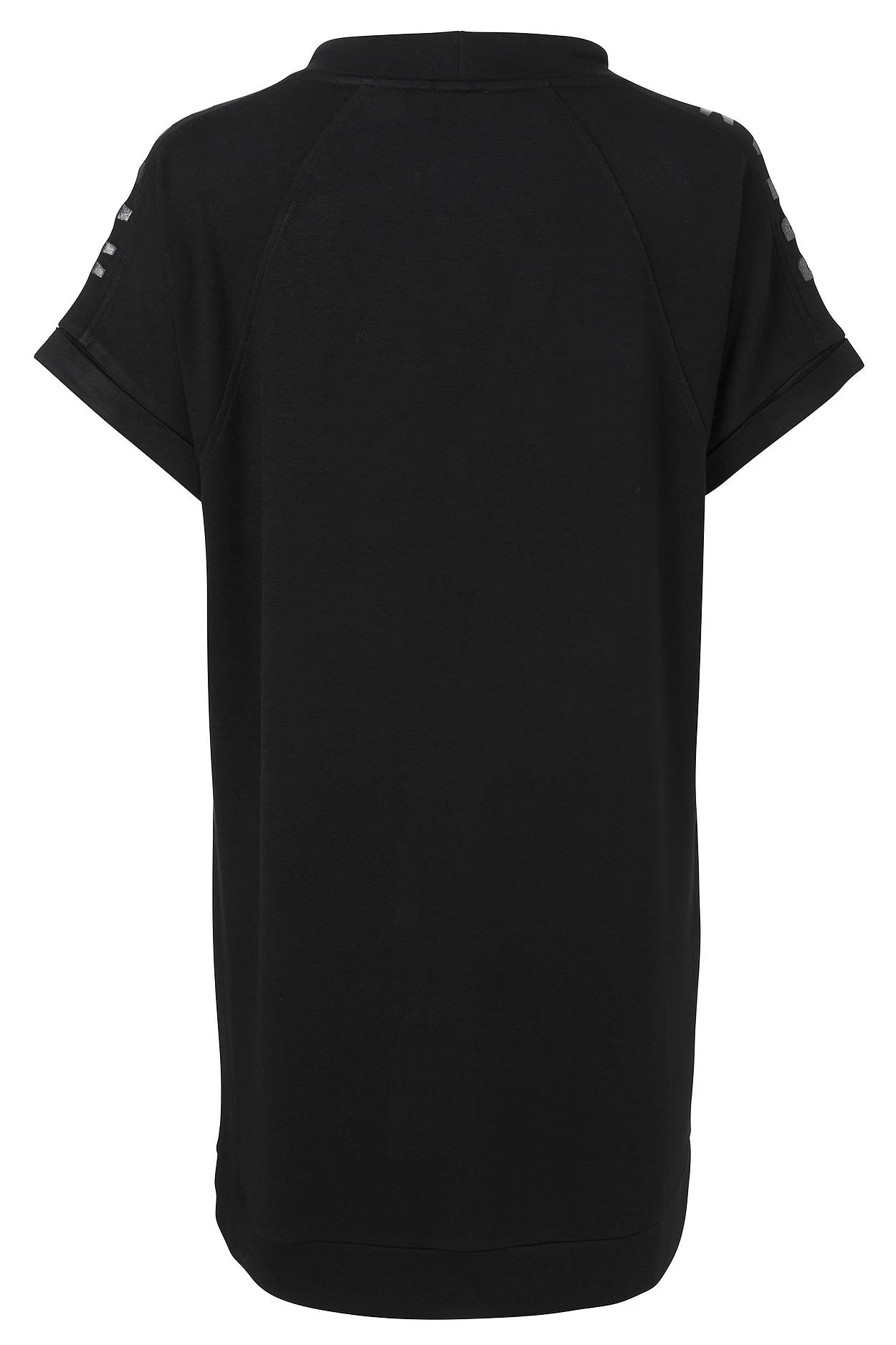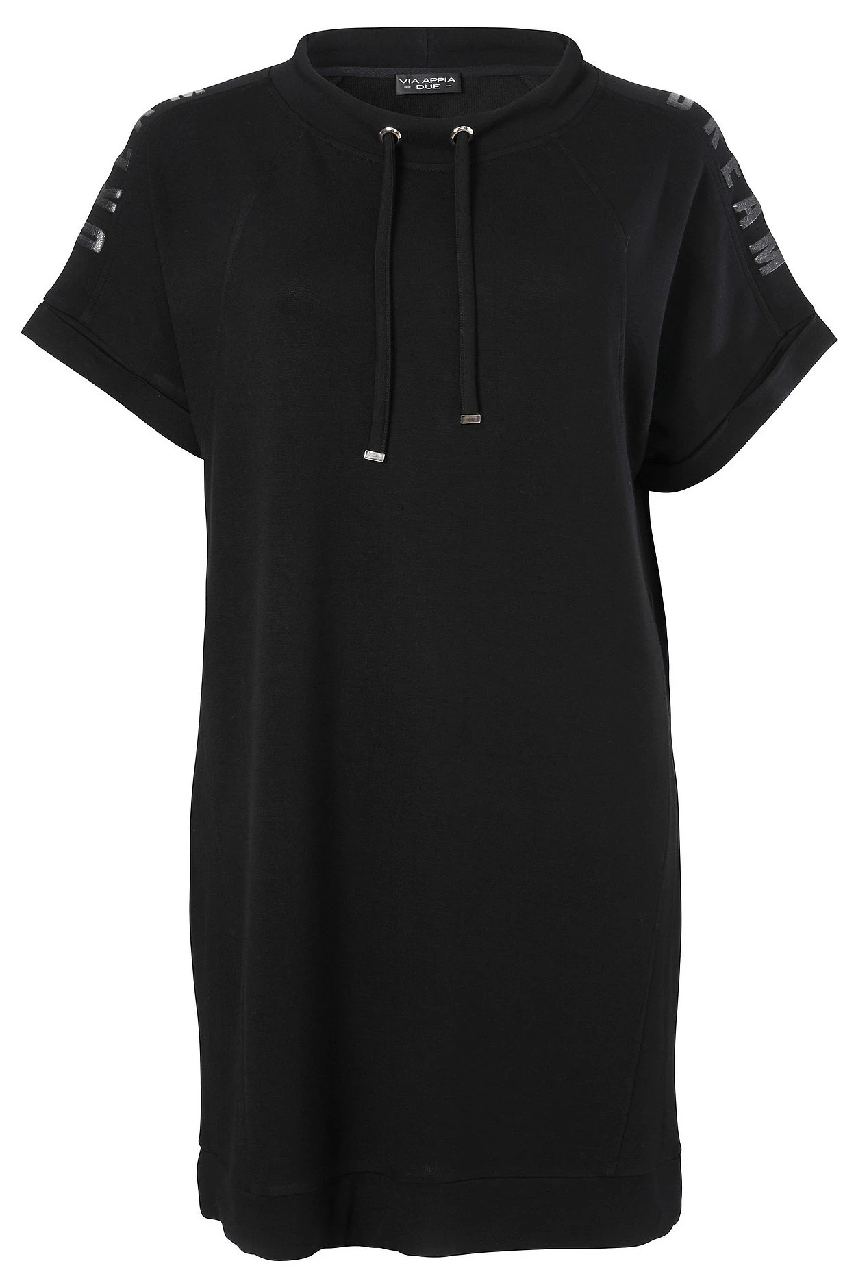 Sweatkleid von VIA APPIA DUE. Das Kleid ist mit kurzem Stehkragen, Tunnelzug und Bindeband gearbeitet. Zum Eyecatcher wird der 3D-Wordingprint auf den Schultern. Die kurzen Ärmel sind überschnitten und runden den Look sportiv ab.
